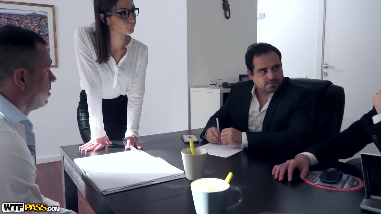 «Сногсшибательная начальница пришла на рабочее совещание в обтягивающей юбке, демонстрируя коллегам на сколько у нее шикарная круглая попка. Находящиеся на работе самцы оценили роскошные формы красавицы, и вскоре один из них проявил смелость и завалил бестию на стол, начав страстно сбрасывать с нее одежду. К радостям кобелям шлюшка не стала им отказывать в удовольствии, позволяя ловеласам начать подготавливать все ее дырки мастурбацией. Как только она достаточно взмокла, малышка с явным экстазом на лице ощутила ни с чем не сравнимое двойное проникновение, о котором она так сильно мечтала идя на работу.»