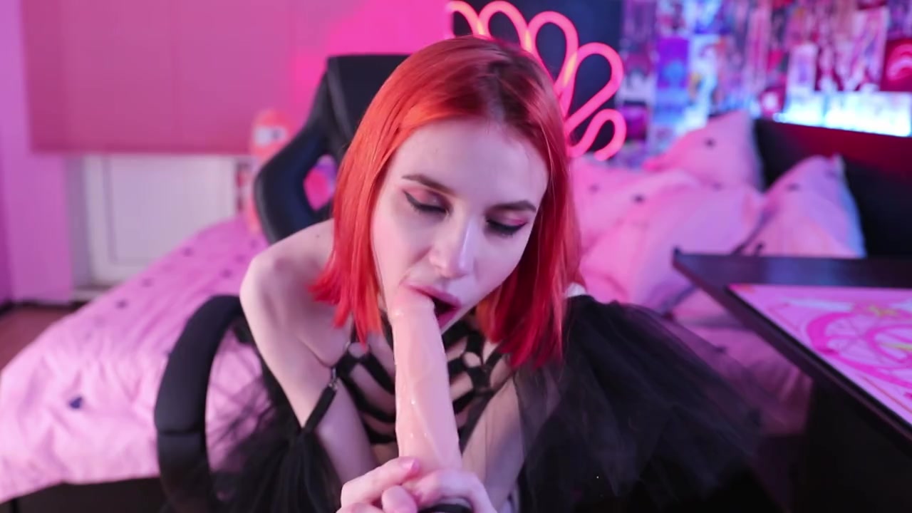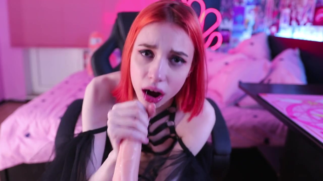 Худенькая краля шалит перед вебкой с огромным резиновым членом