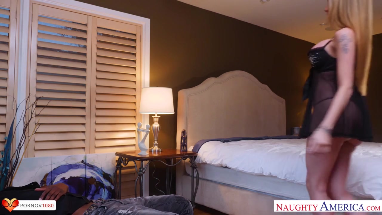 «Смазливая блондинка надевает черное белье и игриво позирует перед негром на кровати, соблазняя его на интим. Эта белокурая проказница имеет сочную попку и силиконовые сиськи, что заводит чернокожего самца не на шутку. Он спешит сперва вылизать её бритую щелку как следует, а потом угощает девицу своим толстым членом. Жаркая цыпочка делает качественный минет и занимается с ним бурным сексом, получая удовольствие.»