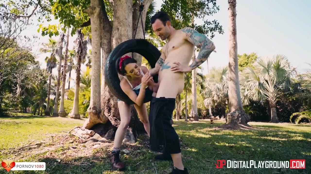 «Гуляя по парку страстная пара заметила обычные качели из автомобильной шины. Черноволосая крошка сразу же предложила использовать эти качели не по прямому назначению, а как секс-качели. Идея пацану понравилась, он тут же засунул телку в шину и принялся её страстно трахать сперва в рот, а потом и в пизду раком. Особенно удобно было ебать проказницу когда она полностью забралась в шину и расставила ноги.»