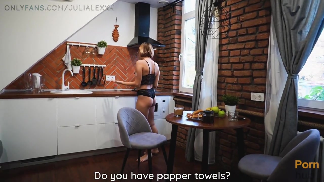 «Проснувшийся парнишка зашел на кухню и увидел подругу которая заваривала себе кофе в сексуальном нижнем белье. Роскошные женские формы тела не оставили кавалера равнодушным, и после непродолжительного флирта белокурая цыпочка согласилась ему отдаться. Запрыгнув к счастливчику под стол белокурая куколка начала воплощать желания самца с очень приятного орального секса, которым она свела с ума множество ухажеров. Оправдав губками все желания партнера девица с радостью наклонилась раком и по полной программе отдалась сзади в излюбленной позе.»