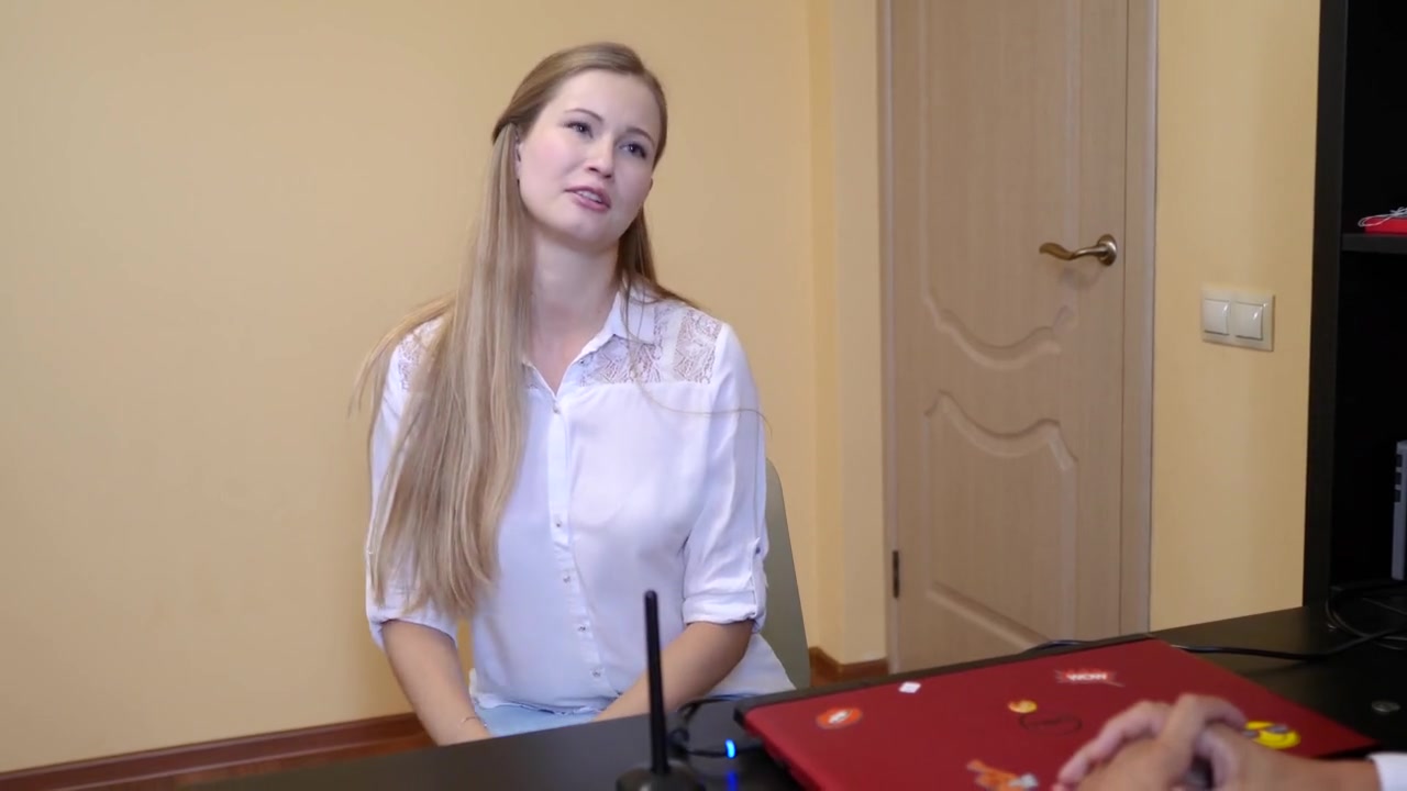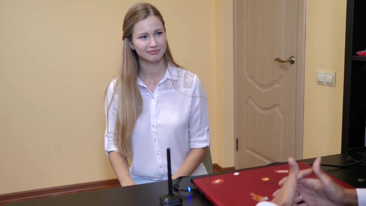 «Миленькая русская девушка пришла на собеседование по работе, где ее сразу проверили на профпригодность. Ей пришлось показать свои сиськи, которые оказались большими и натуральными. С такой горячей блондинкой начальник может отлично расслабиться, потому кандидатке в секретарше предлагает на месте отсосать. Телочку это не шокирует и она лично снимает с босса штаны и берет в рот напряженный член. Быстро делая минет и заглатывая болт все глубже, она ощущает как в нее кончают не вынимая, потому и приходится глотнуть сперму.»