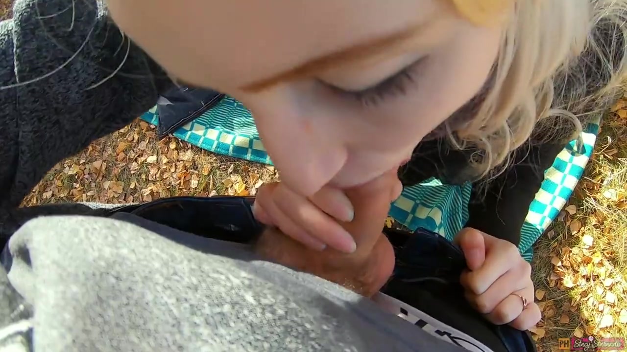 «Миленькая русская девушка думала в бойфренде проснулся романтик, ведь кто еще мог предложить пикник в осенний день. Но вместо угощения чувак побаловал ее на улице своим толстым членом. Крошка не медля приступила сосать на коленках, ощущая сильное возбуждение между ног. Ее киска пылает от желания потрахаться, потому чувак охотно отжарил ее от первого лица, покатав на члене. Быстрый секс сменился очередным минетом, ведь крошка обожает работать ртом, особенно когда в него кончают не вынимая.»