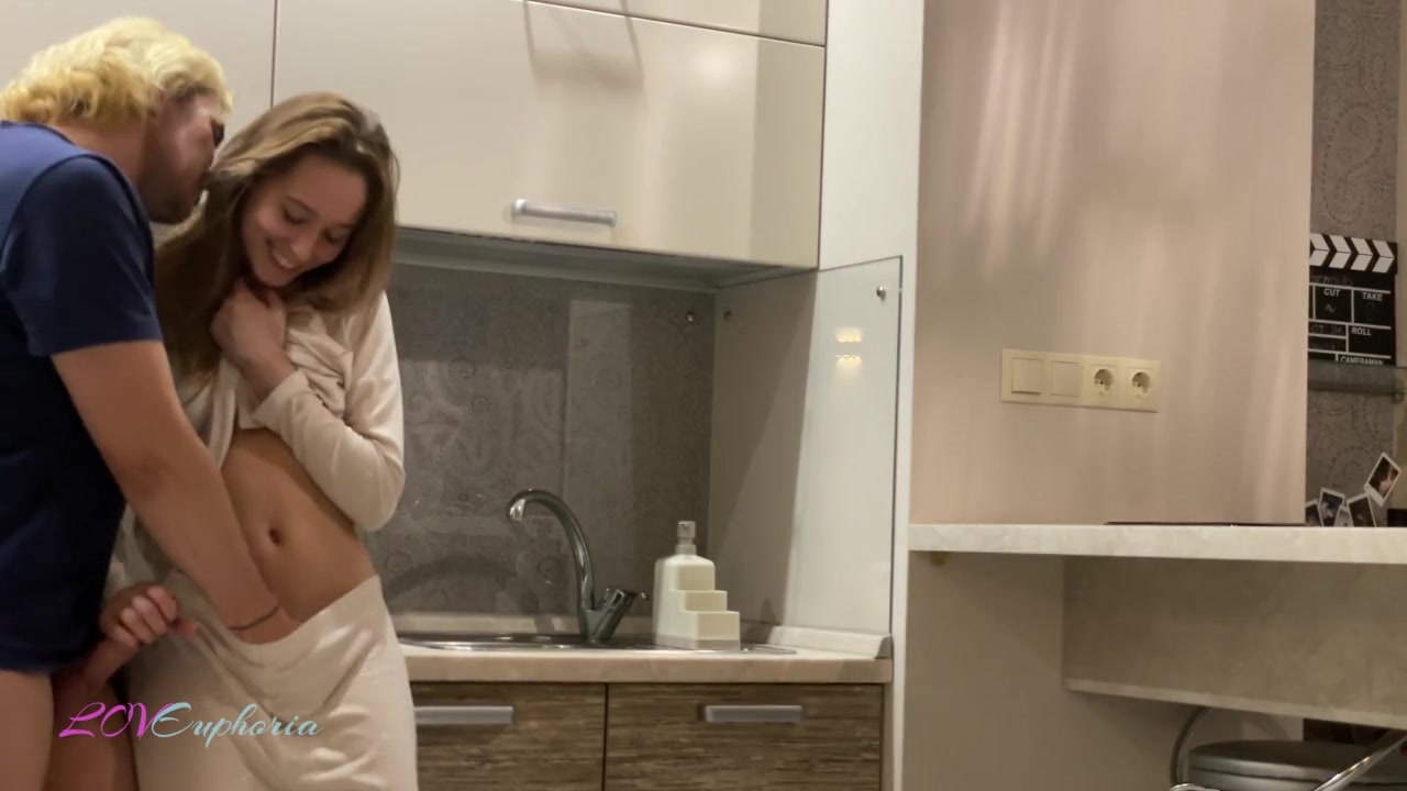Утро жаркой красотки началось с бурного секса раком с кремпаем на кухне