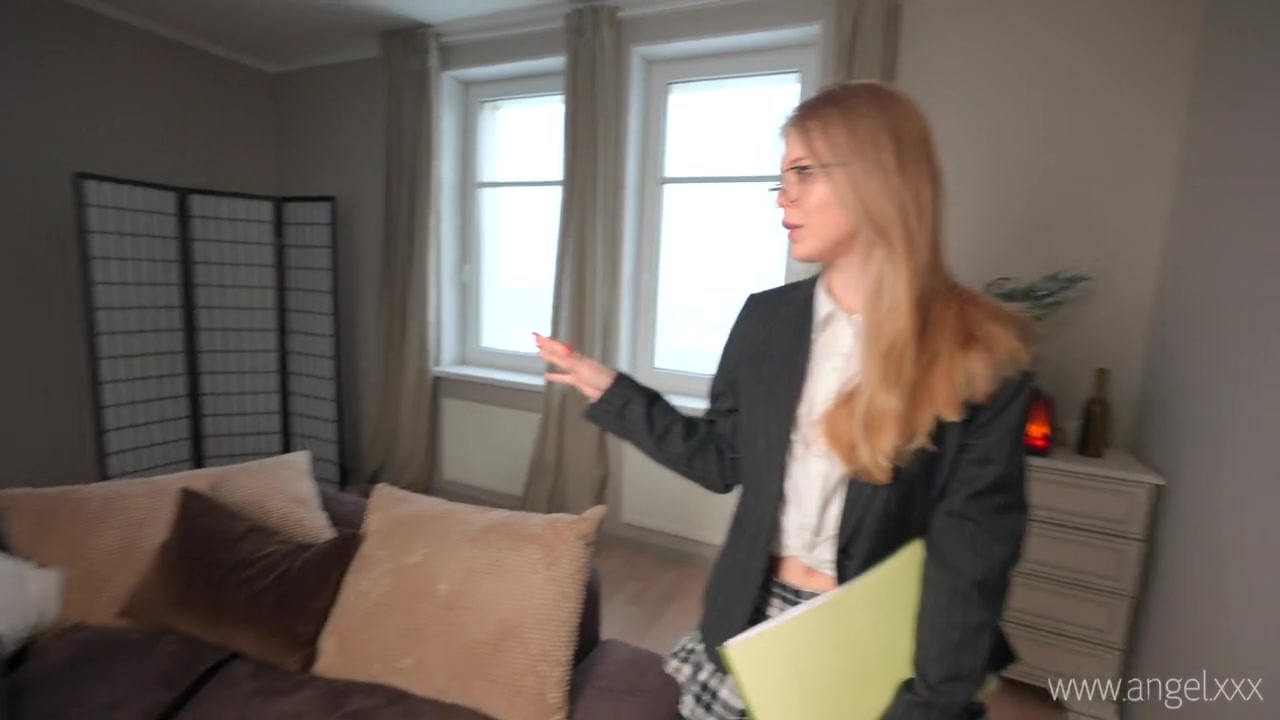 «Парень пришел осмотреть новенькую квартиру, которую планирует арендовать. Экскурсию и все бумажные дела исполнить молодая и красивая девушка в очках, которая готова на многое ради этого заказа. Есть шанс что крошку даже уволят, потому милашка включает режим шлюшки и показывает не только сексуальные чулки, но и симпатичные маленькие сиськи. Не снимая очки блондинка горячо отсосёт длинный член от первого лица, охотно заглатывая его целиком. Ну а после ее гладкая розовая киска будет жарко выебана в разных позах, а на лице окажется камшот.»