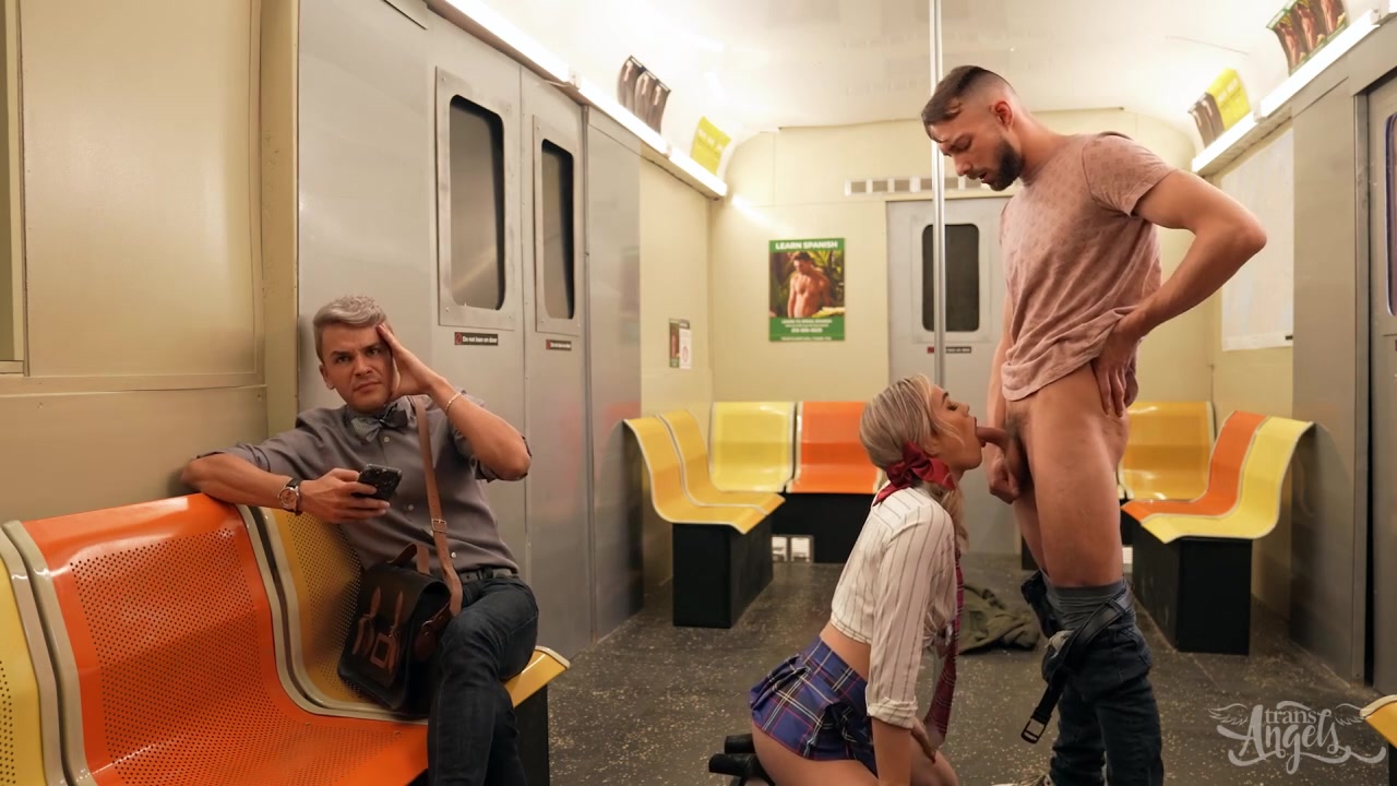 «Длинноногая блондиночка в короткой юбке привлекает много внимания в метро, а когда сучка еще и нагнулась раком без трусиков, то один парень уже едва не потерял сознание от восторга. Крошка просто уронила свою сумку с различными секс игрушками, где есть и плетка и толстый дилдо. Но главное оружие этой сучки это реальный член у нее между ног. Красотка транс готова применить свой хуй даже в общественном месте, сперва легко выебав в рот незнакомого чувака. Этот самец ради такой шлюшки не только отсосать готов, но и охотно даст отжарить себя в жопу. Анальный секс будет взаимным, но оргазм получит лишь блондинка с членом, которая эффектно обкончает любовнику лицо.»
