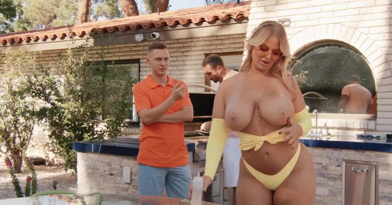 «Мужа нет дома, значит сочная женушка может развлечься. Эта белокурая бестия с большими натуральными сиськами отдается двум молодым паренькам, которые и удовлетворяют все её развратные желания. Трахается милфа страстно и в обе дырочки, но сперва она хочет поработать ротиком. Мамочка прекрасно сосет и наслаждается двойным проникновением. Муж возвращается уже в конце ебли, когда супруга получила оргазм.»