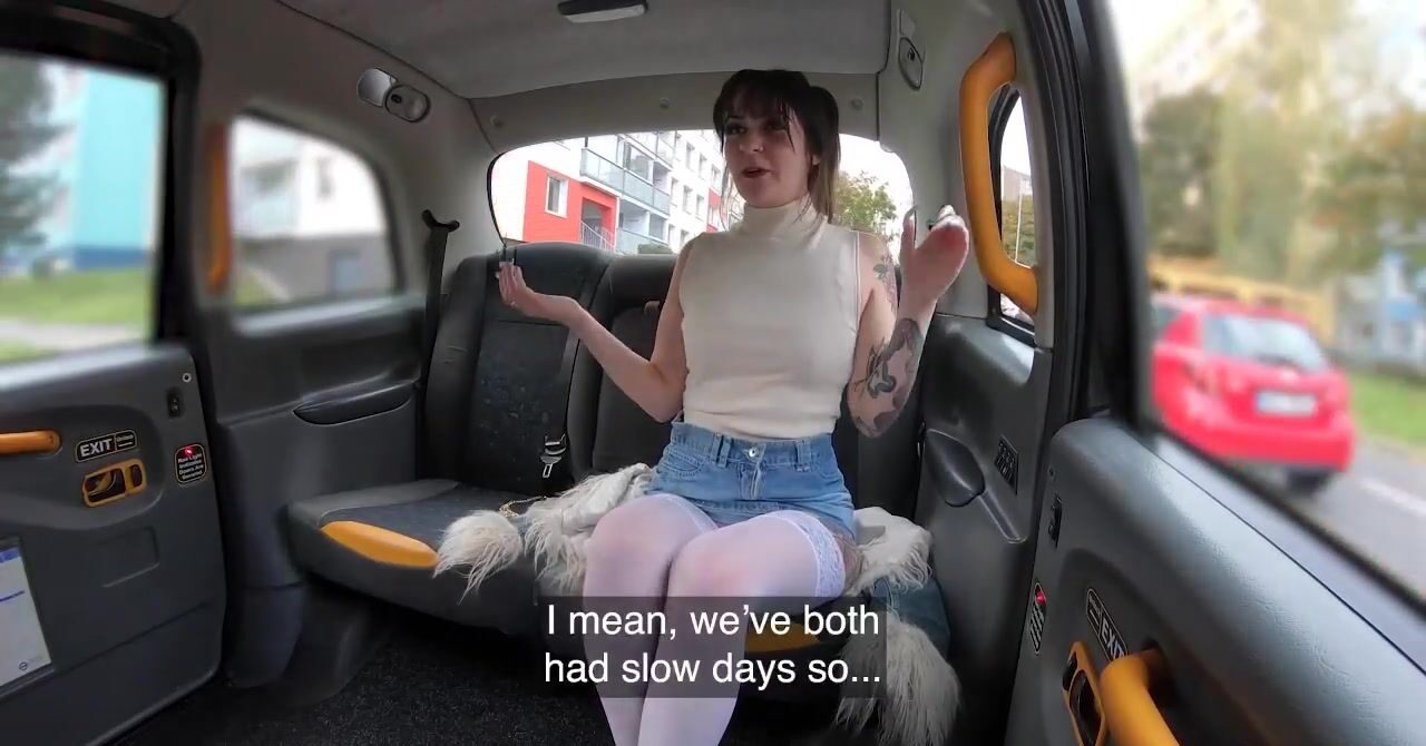«Привлекательная пассажирка соблазняет таксиста, показывая своё тело в розовом нижнем белье. Это действует, водитель спешит припарковать машину в безлюдном месте под мостом, чтобы поскорее трахнуть развратницу. Довольная цыпочка в белых чулках показывает изначально как она умеет сосать, а затем жарко трахается, получая удовольствие сама же. Она уже давно хотела заняться сексом с таксистом и сейчас кайфует по полной.»