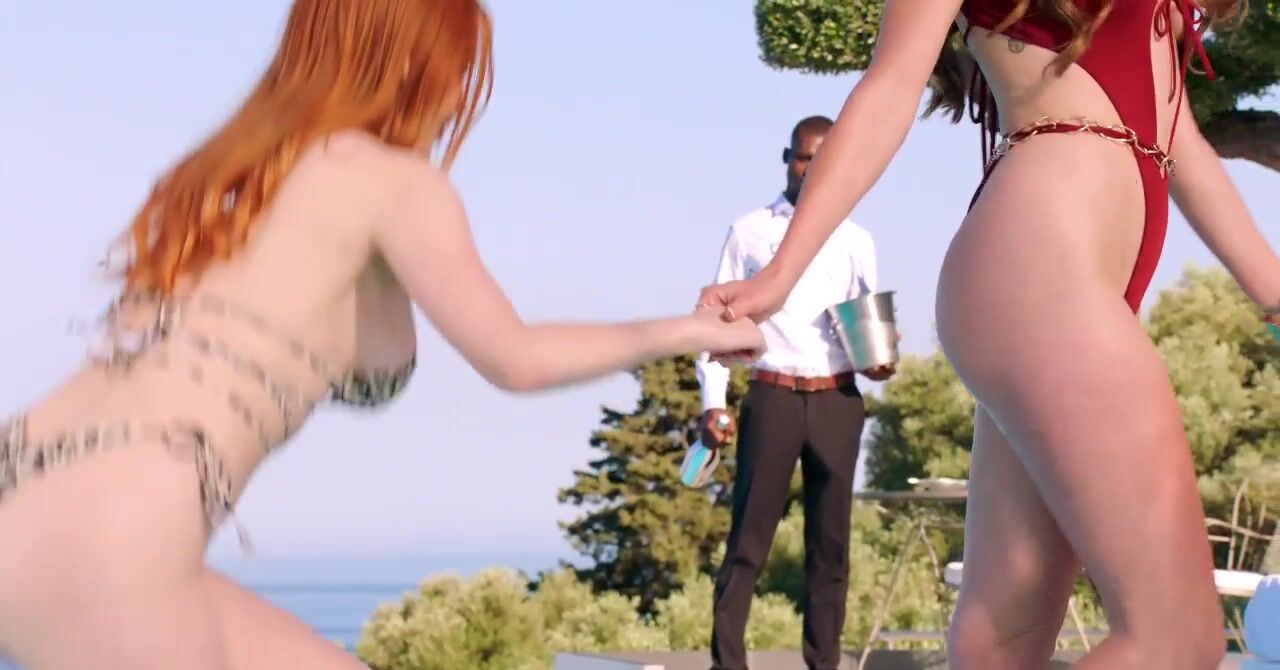 «Две красивые телки отдыхают в шикарном отеле и прекрасно проводят время. Но им кое-чего не хватает для полного счастья, а именно большого члена. Поэтому подруги и соблазняют негра на интим, принимаясь страстно сосать его половой орган прямо около бассейна. Рыженькая бестия и брюнетка с наслаждением сосут хер и отдаются в киски. Чернокожий работник отеля не может отказать двум ненасытным развратницам.»