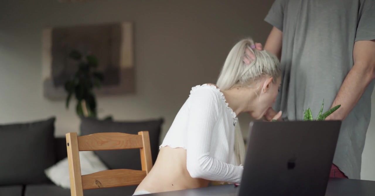 «Милой блондинке надоедает скучная видеоконференция. Она хочет сейчас заниматься сексом с любимым парнем, а не общаться с коллегами. Когда же бойфренд достает свой член и предлагает белокурой цыпочке сделать ему минет за кадром, та тут же принимается сосать. А далее фигуристая крошка с сочными сиськами встает раком и отдается в бритую пилотку. Она делает это пока ошарашенные коллеги смотря и вслушиваются в стоны.»