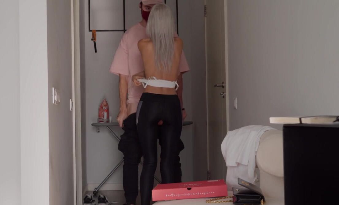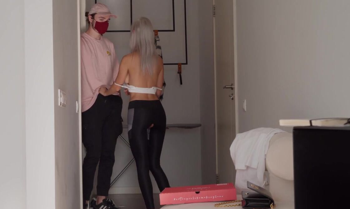 «Вебкам модель ждала курьера и ласкала свою киску пальцами на кровати. Она разорвала лосины, чтобы была видна её бритая киска, а потом пошла встречать парня с пиццей. Милая развратница с большими натуральными сиськами быстро соблазнила пацана. Она опустилась перед ним на колени и стала делать минет, а затем пригласила его в гости, чтобы заняться сексом. Пацан, понятное дело, не отказался от ебли как в порно.»