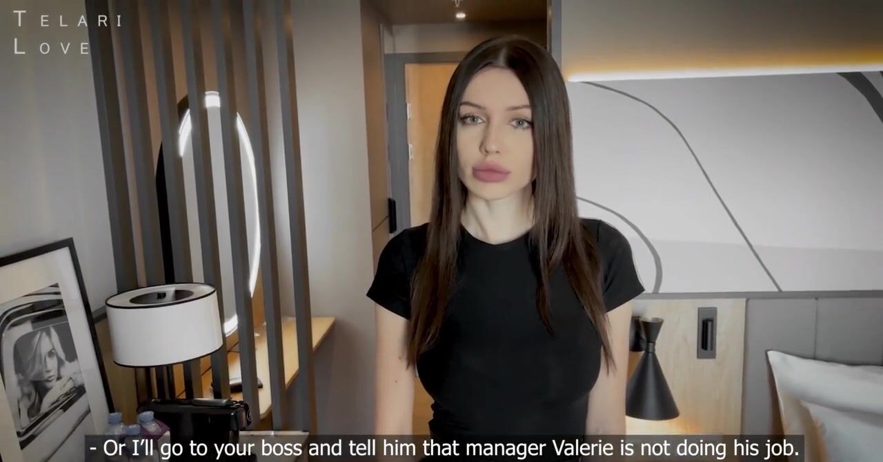 «В гостиничном номере грязно, никто там не убрался после предыдущего постояльца. Мужик вызывает администраторшу, предъявляет ей претензии, а потом ставит телку раком, чтобы наказать её за беспорядок. Черноволосой красотке с пухлыми губами приходится подчиниться. Вскоре гость понимает, что перед ним настоящая потаскуха, ведь у неё на жопе набита огромная татуировка осьминога. Брюнетка обслужила его как нужно.»