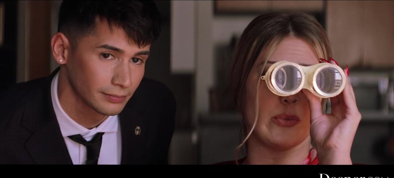«Соседи с биноклем следят за диким сексом в доме напротив. Парень с девушкой завороженно смотрят на страстную еблю. Белокурая девка в красном белье смачно полирует хуй мужика, а так же наслаждается кунилингусом. Они жарятся в разных позах и получают нереальное удовольствие. Блондинка кончает множество раз в самых разных позах. Но дальше стало интереснее, вернулась жена, которая застала мужа в постели с другой.»