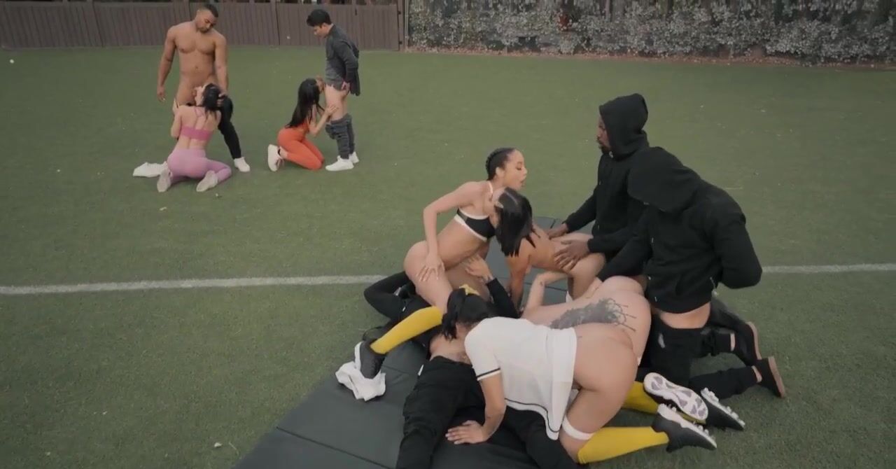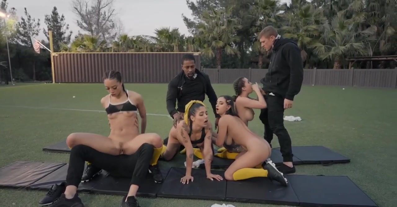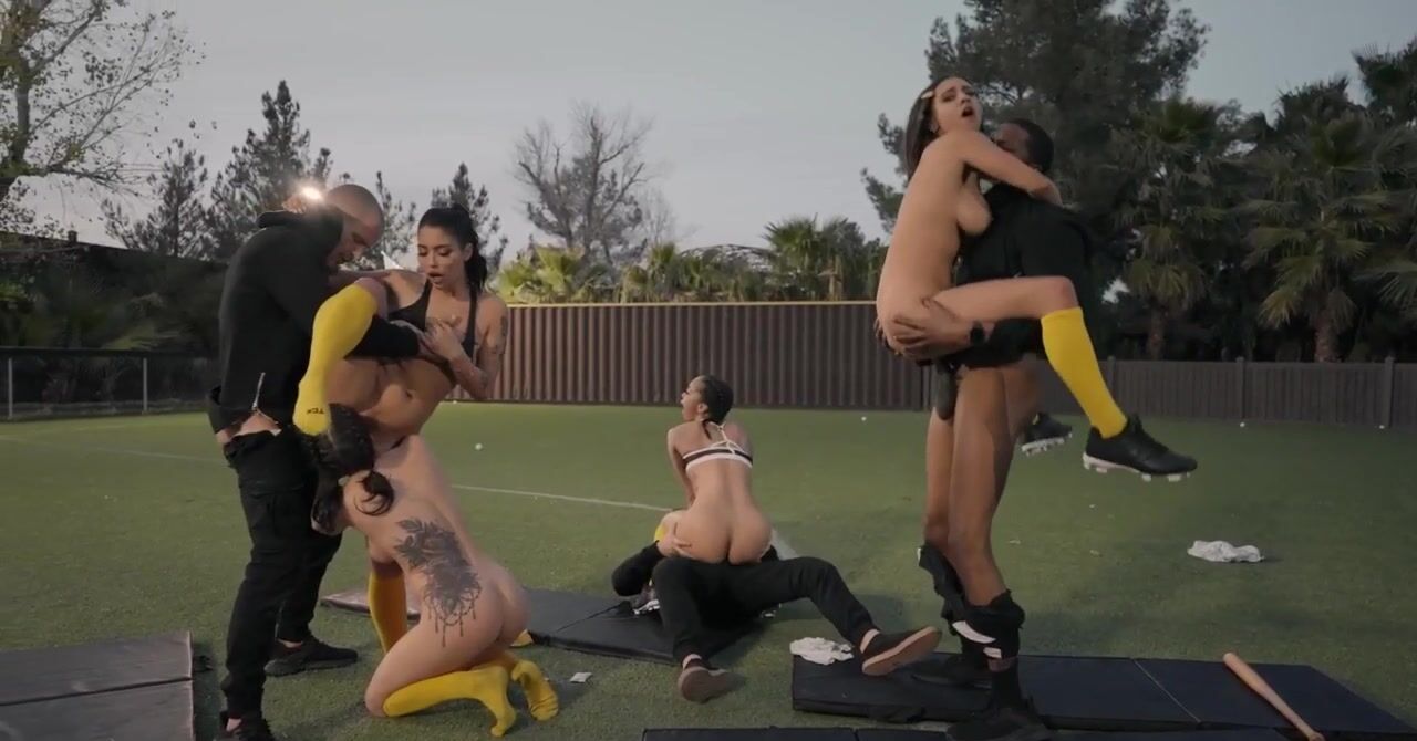 «Женская футбольная команда задержалась на поле и не услышала звук сирен, которые сообщали о начале судной ночи. Мужики же, которые могли в эту ночь делать всё, что им захочется, накинулись на этих красавиц, чтобы их поиметь. Телки только обрадовались, им совсем не страшно. Эти привлекательные цыпочки взялись сосать мужские фаллосы и отдались в киски. Эти проказницы получили нереальный кайф от бурной ебли.»
