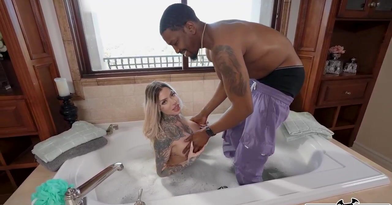 «Татуированная телка с силиконовыми сиськами как раз ласкала свои дойки и киску в ванне, но тут пришел чернокожий приятель. Белокурая бестия попросила его намылить спинку, что парень и сделал. Далее пришлось мыть её грудки, упругую задницу и пизду. Что негр, что телка возбудились до придела и решили заняться сексом. Бестия потянула молодчика в спальню и там развлеклась с ним по полной, приняв в себя большой хер.»