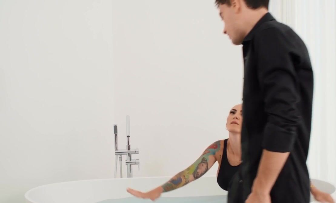 Рыжая телка принимает ванну в одежде и отдается в жопу