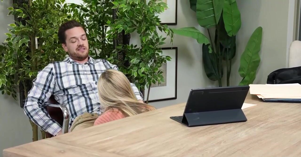 «Новая сотрудница решает заняться сексом с боссом в первый же рабочий день. Эта привлекательная телка оказывается безумно развратной. Она стягивает с начальника штаны в кабинете и обнаруживает, что у него большой толстый хуй. Настроение блондинки становится ещё лучше. Она принимается смачно полировать хер, а потом и в пилотку отдается. Босс трахает её и кончает на лицо, несмотря на наличие любимой жены.»