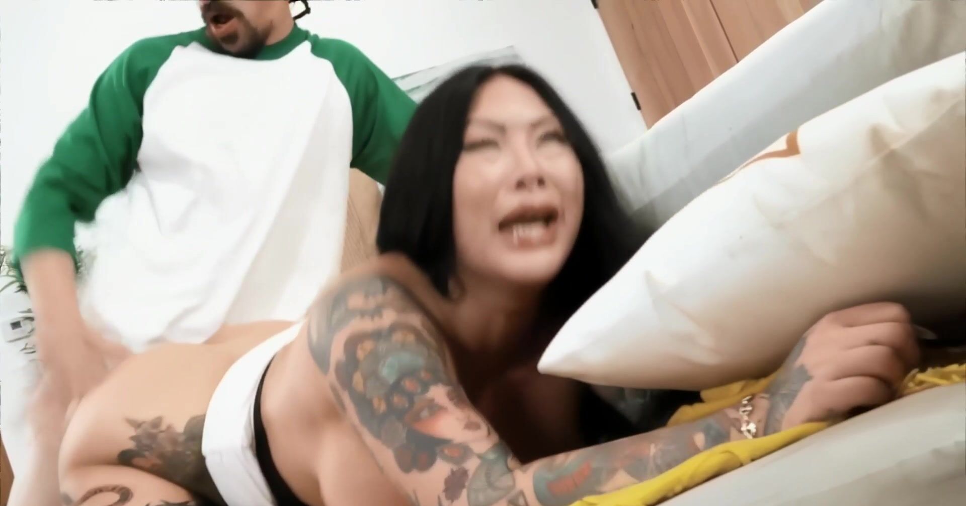 Зрелая татуированная азиатка резвится с пасынком и его девушкой