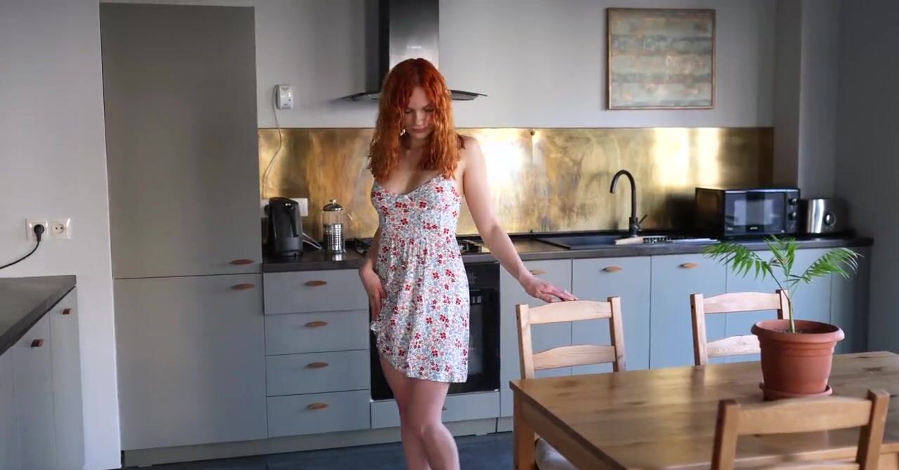 «Рыженькая девушка на кухне игриво приподнимает легкое платье, показывая упругую попку. Она намекает на интим и поглаживает свои соблазнительные сиськи. Уже вскоре цыпочка получает то, что хотела - бойфренд принялся вылизывать её бритую пилотку, а после куни вставил пенис в вагину и трахнул крошку на столе. Та расставляла ноги в стороны, а так же встала раком. Во время полового акта крошка и минет сделала.»