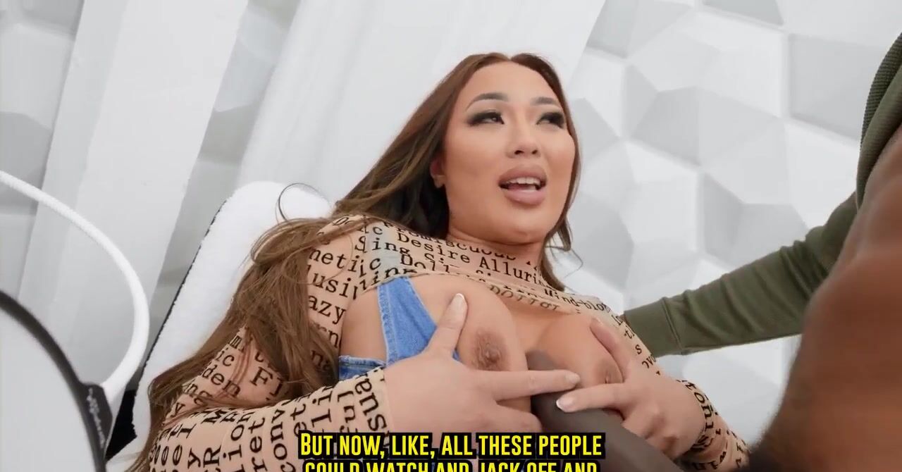 «Жаркую азиатку пригласили на подкаст, чтобы она в студии занялась с негром. Цыпочка с сочной жопой с радостью взялась сосать крепкий хуй чернокожего самца и делала это громко, чтобы слушатели хорошо всё слышали. Далее потаскуха уже отдалась в пизду и получила нереальный кайф. Она извивалась и стонала возле микрофонов. После того как сперма пролилась ей на лицо, цыпочка дала небольшое интервью и рассказала и своих сексуальных предпочтениях.»