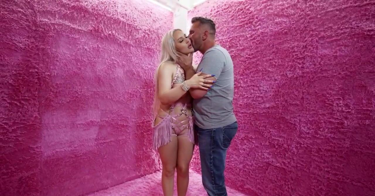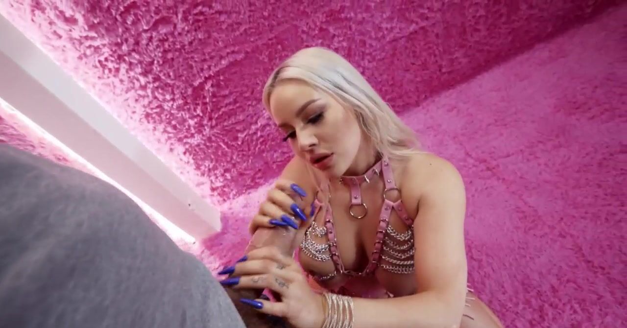 «Жаркая пара в розовой комнате с пушистыми стенами и потолком занимается диким сексом. Блондинка сперва показывает как развратное белье сидит на её сочном теле. Белокурая бестия демонстрирует упругую задницу и большие сиськи, а затем принимается отсасывать крепкий хуй самца и садится ему на лицо, чтобы наслаждаться оральными ласками. Далее блондинка уже наслаждается еблей, она стонет в процессе и кончает.»