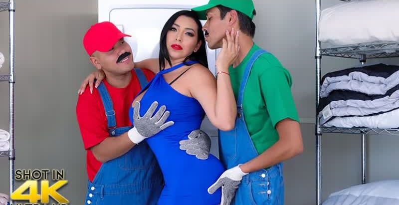 «Сочная хозяйка, вызвавшая на дом сантехников братьев Марио, случайно застряла в сломанной стиральной машине, которую те обязаны были починить. Один из братьев не растерялся, он задрал платье брюнетки и стал её страстно ебать в пизду. Второй тоже не стал стоять в стороне, а подключился. Уже вскоре они спасли несчастную и вместе отжарили её в пизденку по очереди. Милфа во время МЖМ ещё и миент им сделала.»