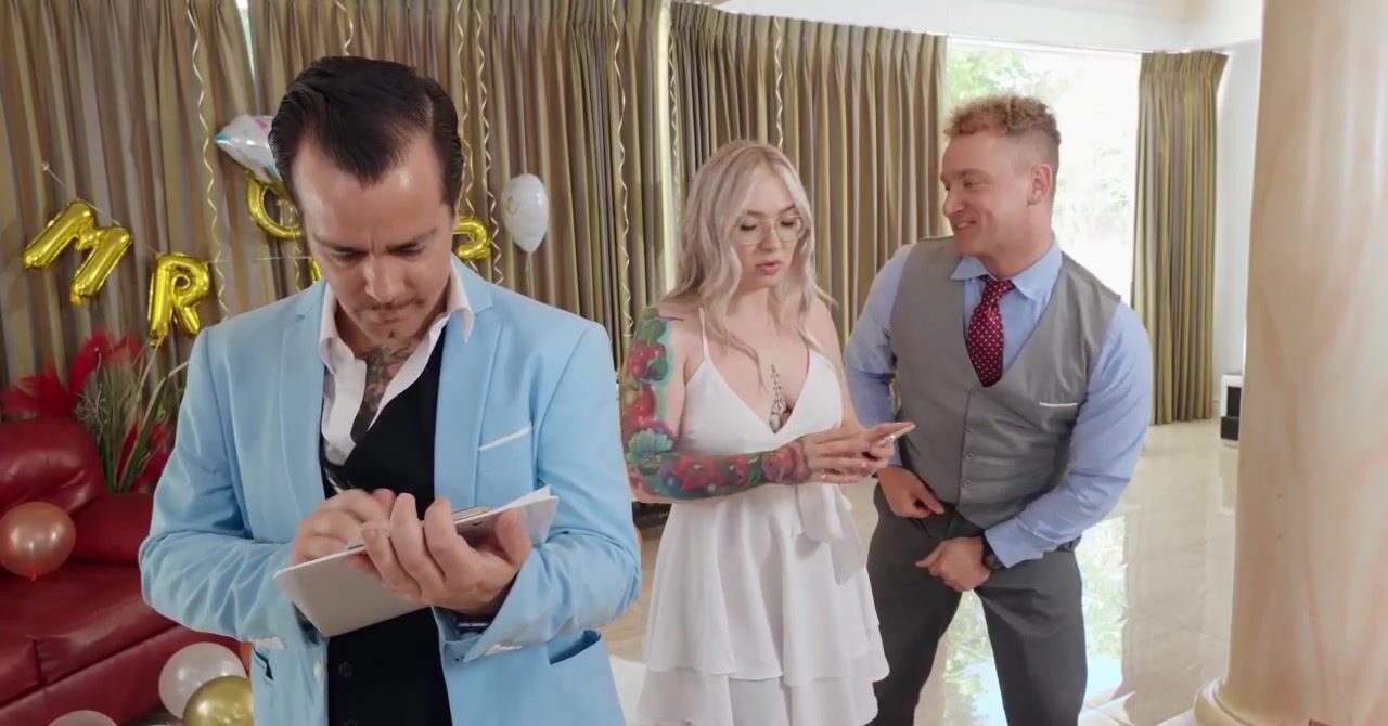«Жениха перед свадьбой соблазняет на секс зрелая подруга невесты и молодая негритянка. Рыжая милфа с силиконовыми сиськами оказывается самой развратной и опытной из них, она во время ЖМЖ как лижет пизду чернокожей брюнетки с кудрявыми волосами, так и хуй парня отсасывает. Чел давно так не кайфовал, как во время этой ебли, он насладился жаркими кисками и ротиками по полной, с будущей супругой ему никогда не было так хорошо.»