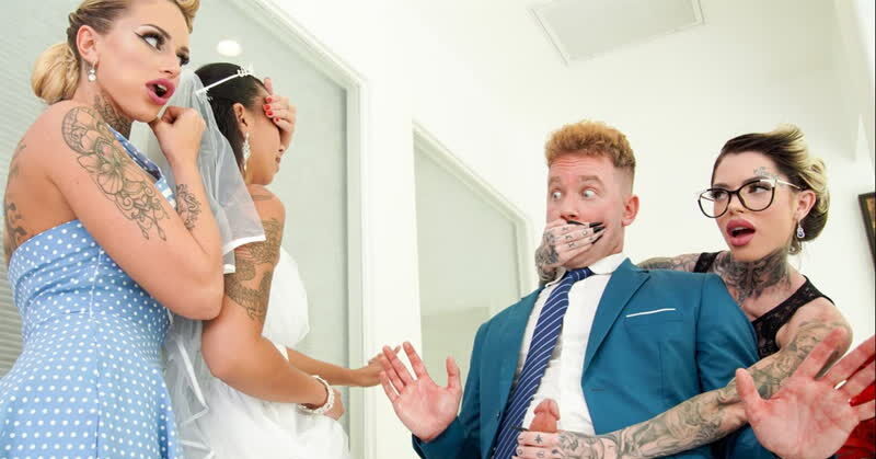«Две татуированные невесты решают расслабить жениха перед свадьбой с помощью группового секса. Одна из них только что ласкала пизду невесты, чтобы расслабить и её, а теперь жаркие проказницы уже страстно отсасывают хуй мужика и жарко с ним ебутся в пизденки на кровати, получая удовольствие от ЖМЖ. Чел насладился как их ротиками, так и пизденками, а после полового акта с окончанием на лица пошел под венец.»