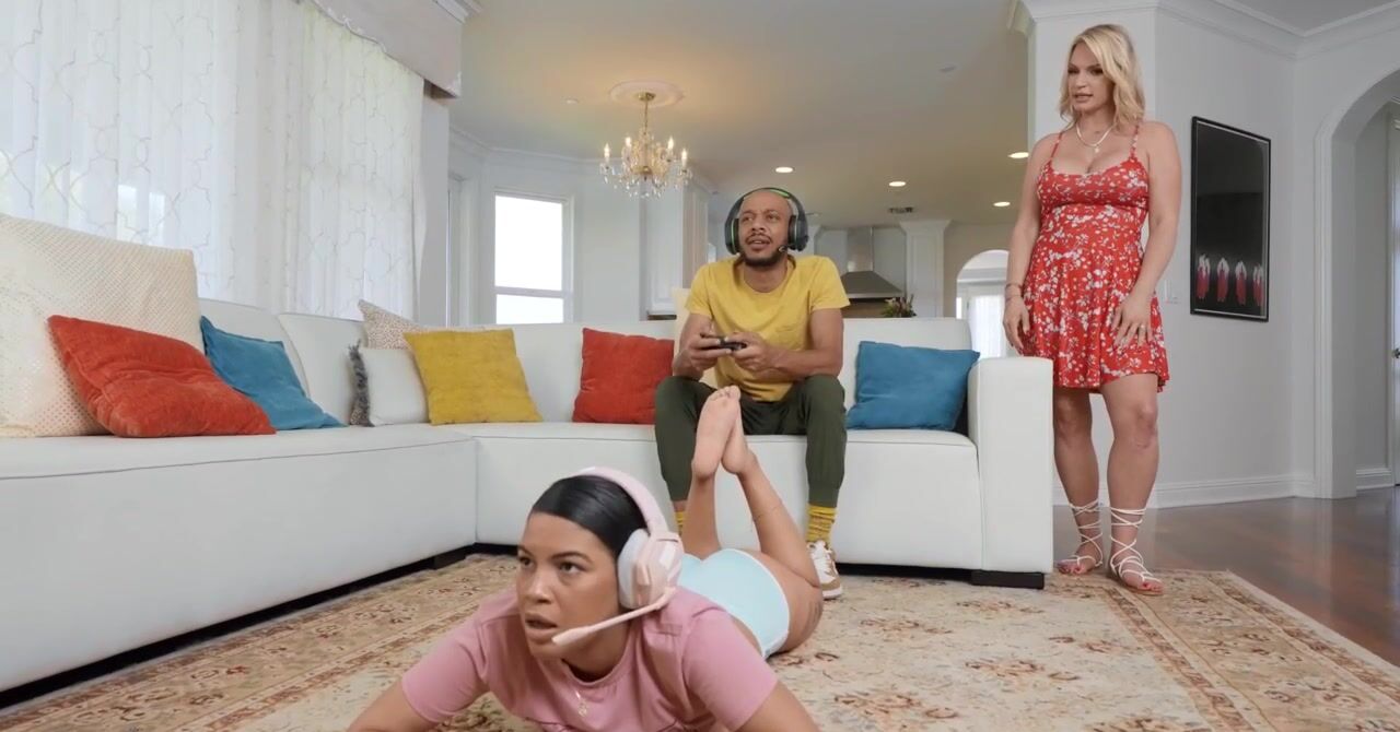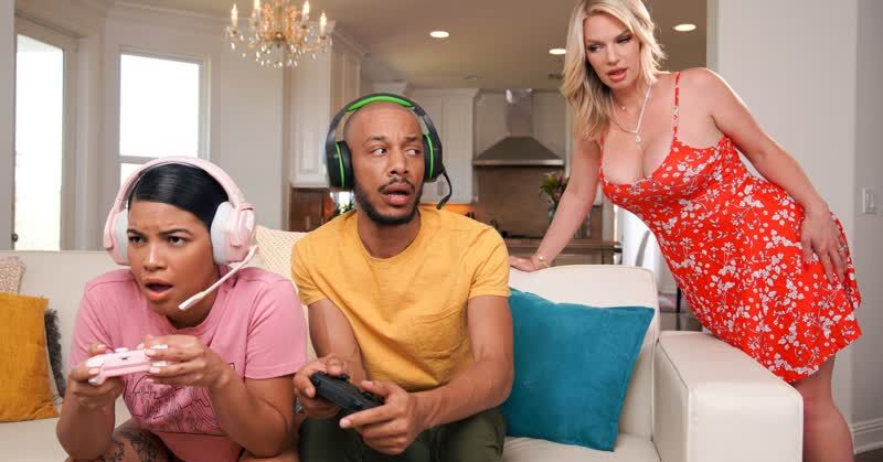 «Чернокожий парень играет на приставке с сестрой и проигрывает, ведь его отвлекает сочная мачеха в легком платье, которая намекает на интим. Эта жаркая бестия хочет заняться сексом с пареньком. Она берется его возбуждать и принимается делать смачный минет, усердно работая своим ротиком. Далее белокурая милфа с большими сиськами и жопой тянет пасынка уже в спальню, чтобы там заняться вагинальным трахом.»