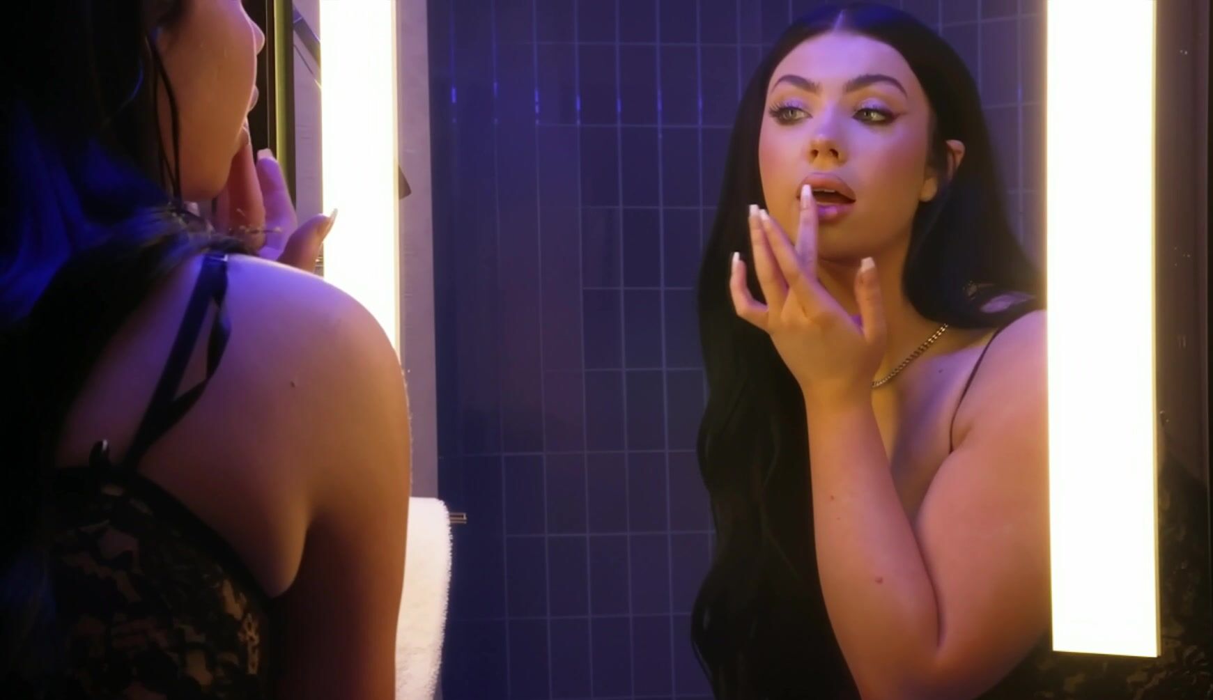 «Красивая проститутка получает деньги, а уже потом удовлетворяет клиента. Привлекательная брюнетка с сочным телом уединяется в ванной комнате и там переодевается. Черноволосая цыпочка с большой жопой надевает сексуальное белье, после чего принимается ублажать молодчика. Она делает ему смачный минет и садится на лицо, ведь парню захотелось сделать ей куни. Жаркая развратница сама получила удовольствие от работы.»