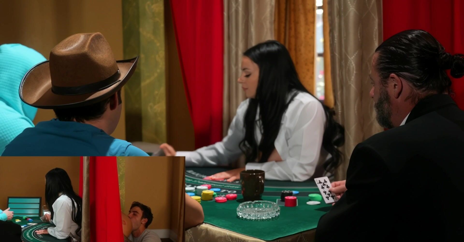 «Парень приходит в казино, но не садится играть за стол, вместо этого он принимается ласкать большие сиськи привлекательной девушки крупье. Черноволосая крошка разрешает это делать, сама же возбуждаясь. Брюнетку не смущают другие посетители, которым она во время секса раздает карты. Вскоре развратница отсасывает хуй гостя и отдается ему в пизду на столе, получая удовольствие и сладко постанывая от кайфа.»