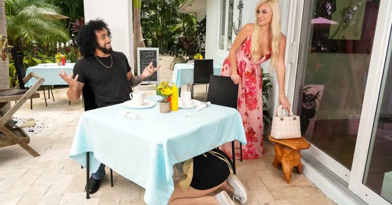 «Кудрявый негр пошел на свидание с привлекательной девушкой, но трахнул он совсем не её, а жаркую официантку. Эта белокурая цыпочка приняла заказ, а затем соблазнила чернокожего клиента на дикий секс. Она сделала ему минет под столом, после чего отвела самца в туалет и там продолжила сосать его болт, а так же отдалась в мокрую пизду, получая удовольствие. Девка насладилась межрасовой еблей и получила сперму на лицо.»
