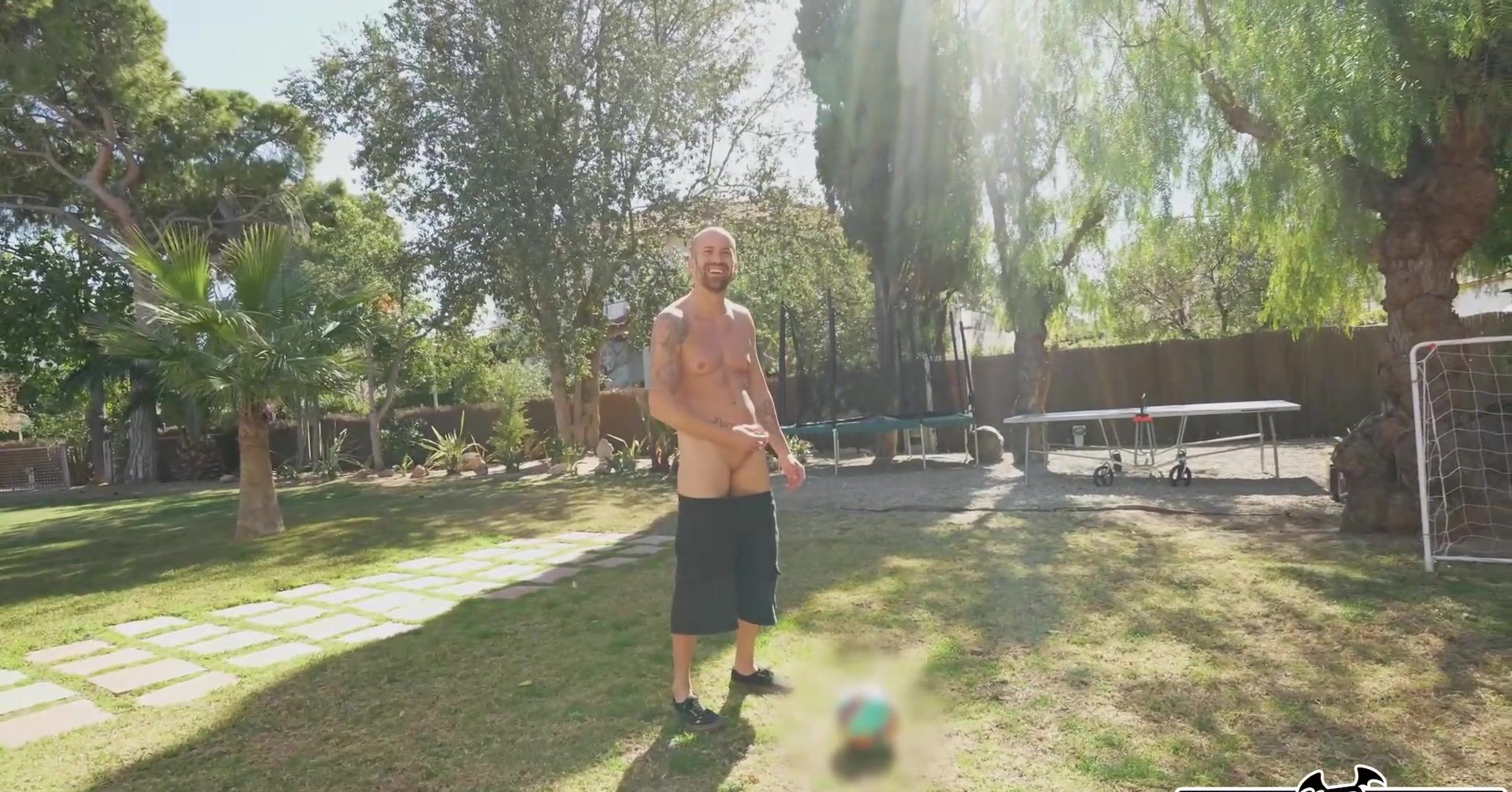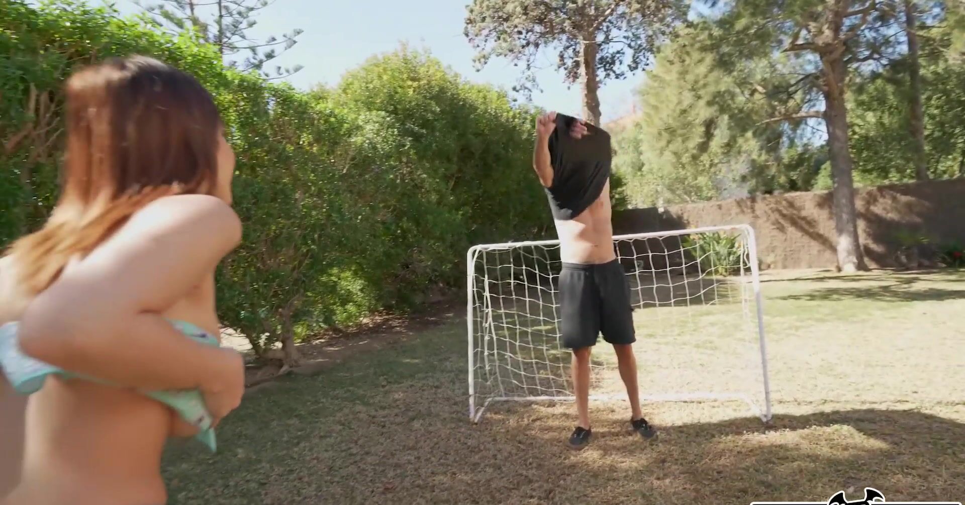 «А лысому мужику понравилась идея сыграть в футбол на раздевание. Он забил несколько голов рыжей подруге и та показала свои силиконовые сиськи с пирсингом сосков. Уже вскоре он сам разделся и показал стоячий хуй. Всё не ограничилось одной игрой, парочка ещё и занялась бурным сексом. Телка оказалась нереально страстной сучкой, которая сделала прекрасный минет и отдалась в бритую пизду прямо на улице.»