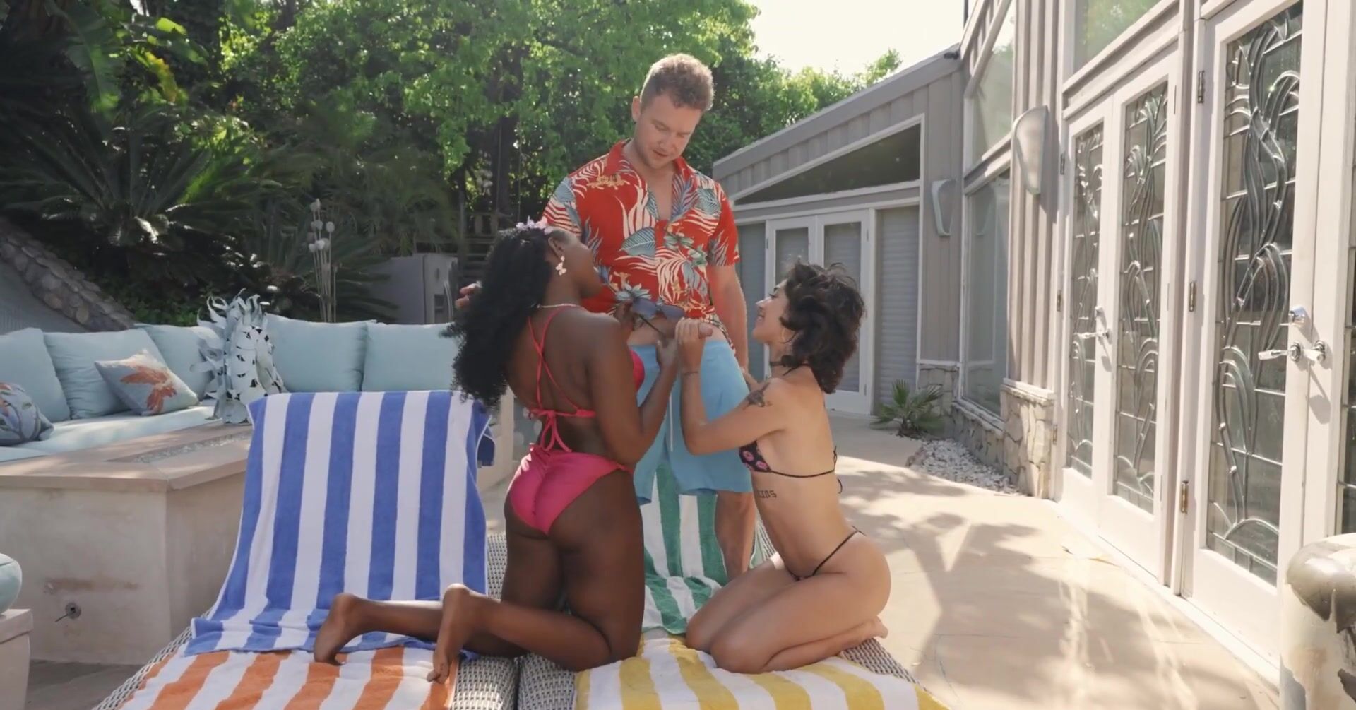 «Белая девушка и негритянка ласкают друг друга пока приятель у бассейна с завистью смотрит на них. Наконец привлекательные цыпочки в купальниках предлагают ему заняться межрасовым сексом втроем. Эти жаркие худышки стягивают с молодчика трусы и делают самый лучший минет в его жизни, отчего самец издает томные стоны. Далее он уже принимается активно трахать негритянку и белую худышку с татуировками на теле.»