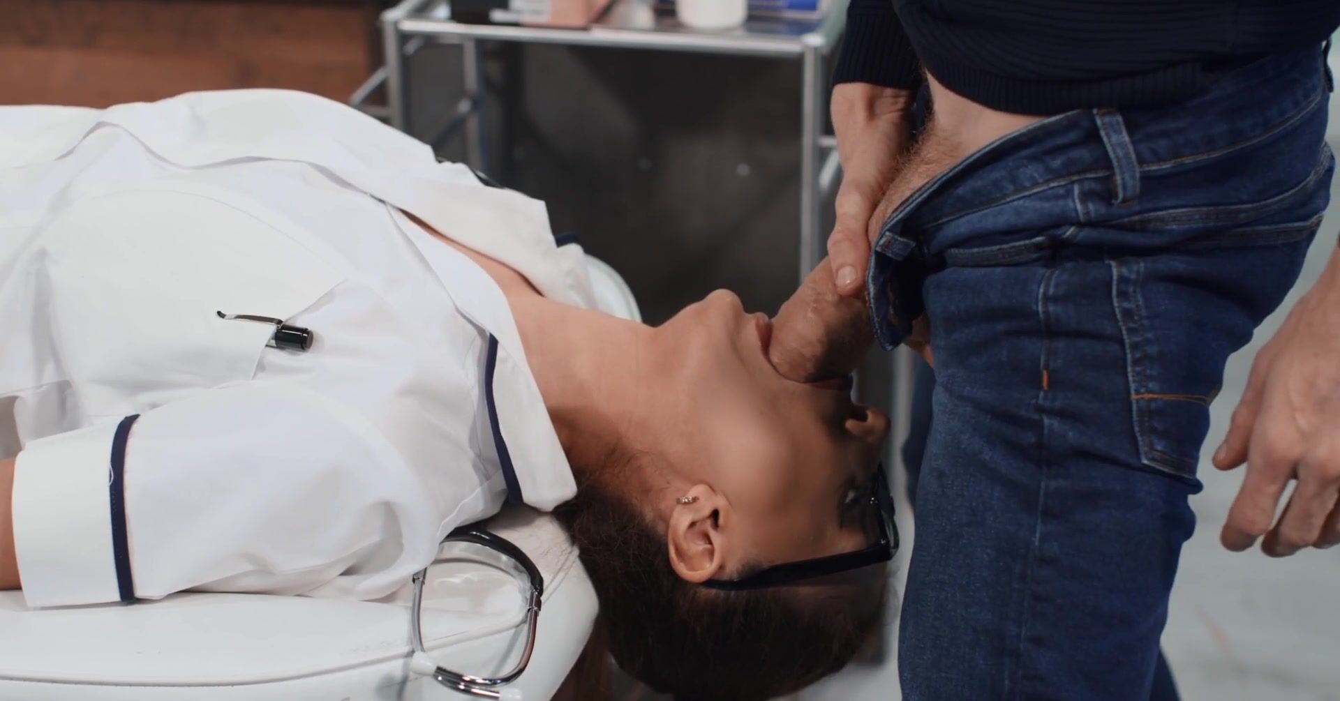«Докторша в очках не смогла сдержать восхищение большим и толстым членом пациента, который приходит на плановое обследование. Рыжая медицинская работница стала игриво ласкать его хуй и завелась ещё сильнее, ведь болт напрягся. Теперь бестия уже не смогла сдержаться, она принялась его отсасывать, а потом сбросила белый халат и отдалась в бритую пизду. Хер смог подарить ей несколько мощных оргазмов, от которых она стонала.»