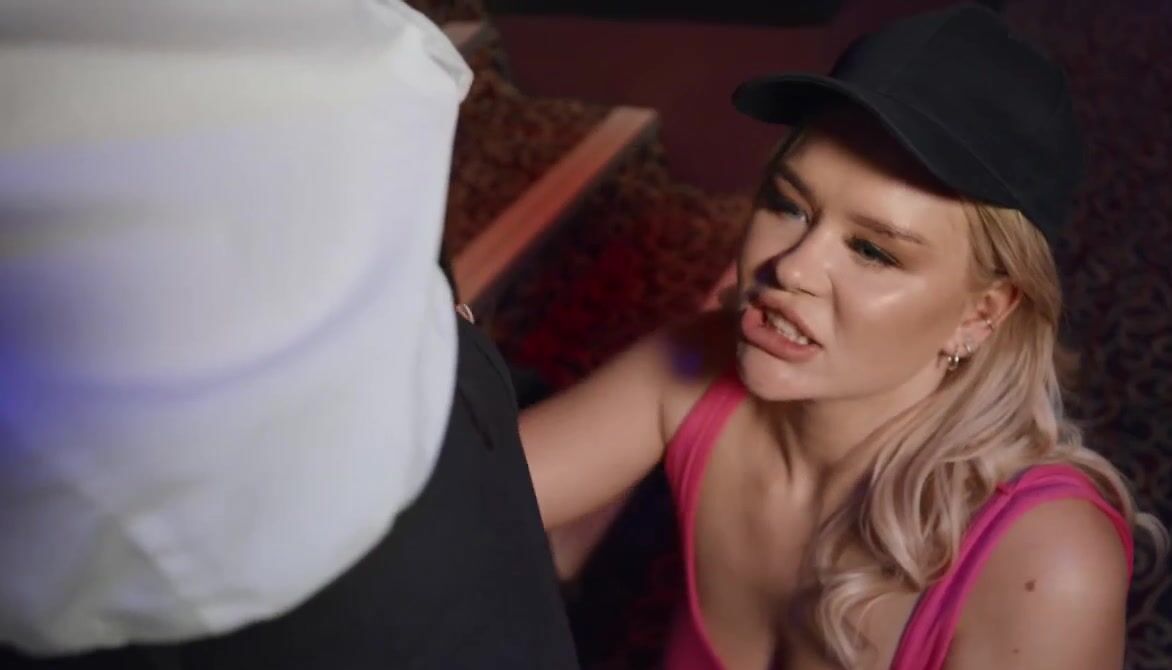 «Развратная блондинка в ресторане под столом мастурбирует член бойфренда, а потом решает заняться сексом с официантом, ведь ей показалось, что у того в штанах скрывается большой хер. Так и случилось, у него действительно был пенис солидного размера, намного больше, чем у бойфренда. Поэтому белокурая девка принялась делать ему минет, а потом потянула незнакомца в туалет и там отдалась в большую попку.»