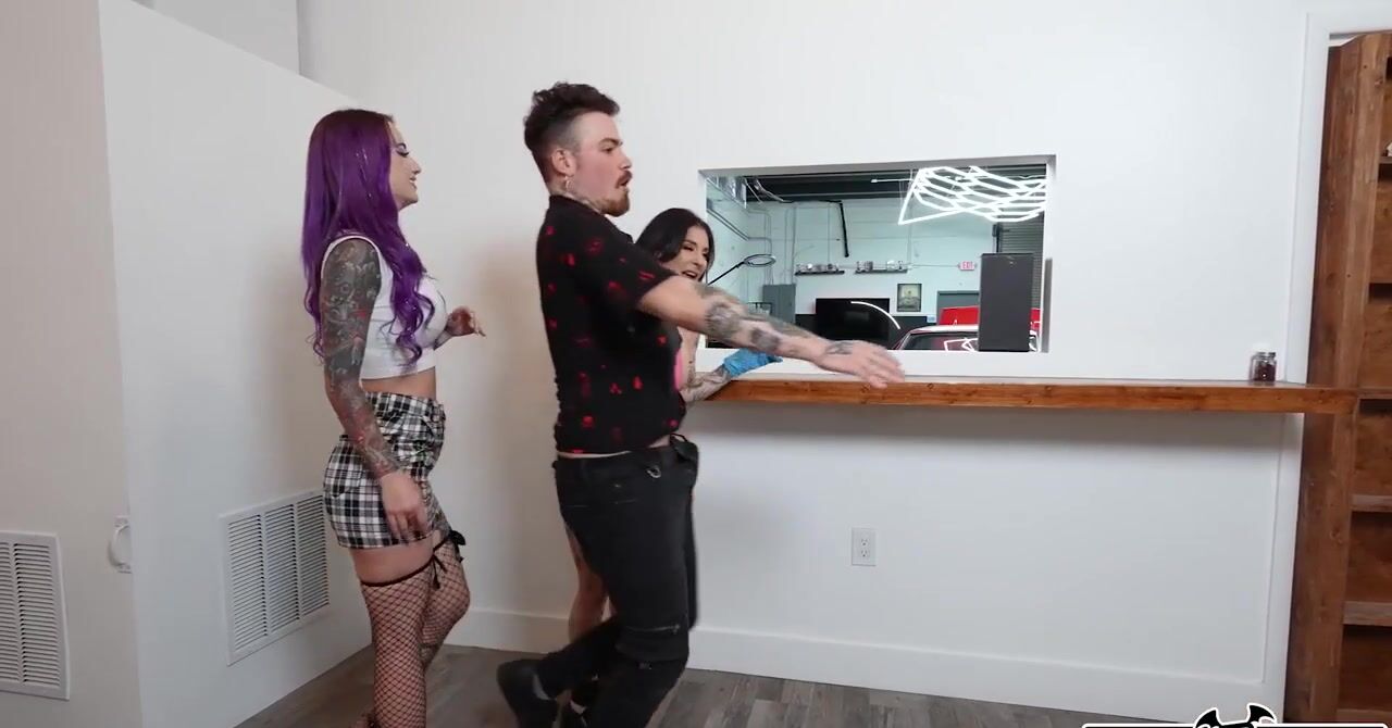 «Мужик в тату салоне угощает членом зрелую татуировщицу. Опытная брюнетка не отказывается от крепкого хуя, она берется сосать его прямо за работой и получает удовольствие от жаркого минета. Далее к ним присоединяется ещё и привлекательная клиентка с фиолетовыми волосами, которая тоже хочет насладиться еблей. Вместе сучки берутся страстно сосать фаллос и отдаются в пизденки, наслаждаясь жаркой еблей втроем.»