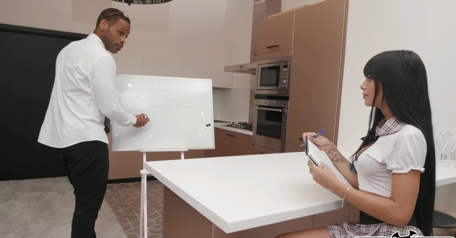 «Чернокожий репетитор по математике замечает, что студентка в своей тетрадке рисует большие члены, а не формулы. Раз так, то он вываливает свой крепкий фаллос, чтобы телка удовлетворила свои желания, а потом они могут продолжить заниматься. Вскоре пришел и второй препод, который обычно занимался с брюнеткой физикой. Он тоже был черным и тоже имел большой хер. Довольная цыпочка отдалась учителям в обе дырки, кайфуя от двойного проникновения.»