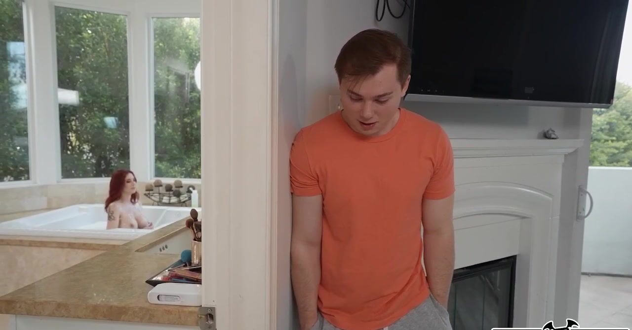 «Рыжая мачеха принимает ванну и замечает, что за ней подсматривает пасынок. Зрелую женщину с силиконовыми сиськами это не смущает, она зовет к себе паренька, чтобы тот её помыл. Смущенный чел принимается ласкать большие грудки опытной милфы, испытывая ещё более сильное возбуждение. Мамочка тоже заводится. Она достает хуй молодчика и берет его в ротик, а после минета ведет парня в спальню и там жарко ебется.»