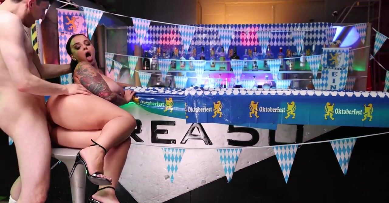 «Сочная барменша на октоберфесте решает немного расслабиться и заняться сексом, поэтому она на интим соблазняет молодого клиента. Это случается уже под закрытие, когда бар пустеет. Пацан рад поиметь такую жаркую бестию с большой попой и натуральными сиськами. Брюнетка ему принимается делать сперва глубокий минет, а потом отдается уже в пизду и наслаждается половым актом, который заканчивается спермой на её лице.»