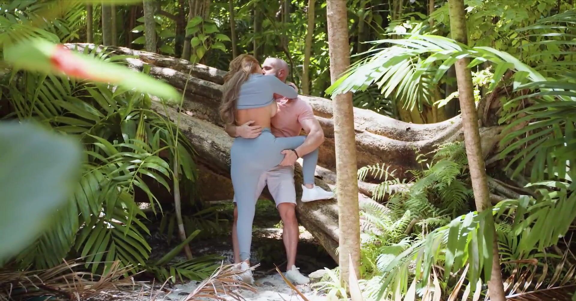 «Накачанный мужик ведет привлекательную телку в лес, чтобы там с ней заняться сексом. Белокурой девчонке с большими силиконовыми сиськами такая идея нравится, она с удовольствием раздевается в лесной чаще и отдается мужику в бритую пизду с пирсингом клитора. Цыпочка ещё и минет ему делает, опустившись на корточки. Жаркая ебля на свежем воздухе ей очень понравилась, бестия кайфонула и разрешила кончить в вагину.»
