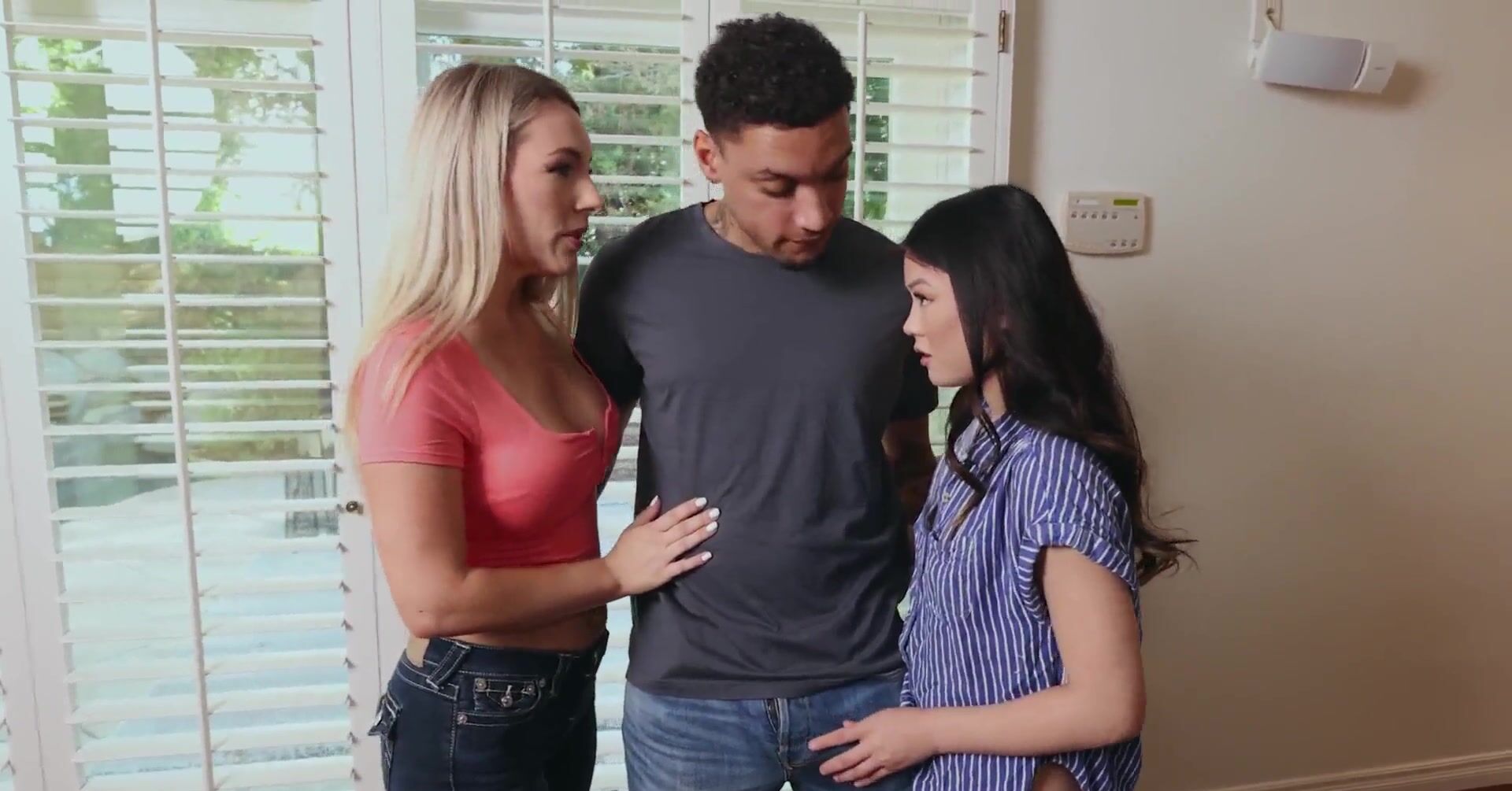 «Белокурая милфа разводит худенькую азиатку на однополый секс, она принимается вылизывать её киску на кухне, отодвинув трусики девушки в сторону. Уже вскоре к ним присоединяется негр с большим членом, который удовлетворяет как миниатюрную азиатку, так и зрелую бестию. Обе развратницы смачно полируют его пенис, а потом отдаются в киски и наслаждаются половым актом. Кончает чел на попку азиатки и лицо милфы.»