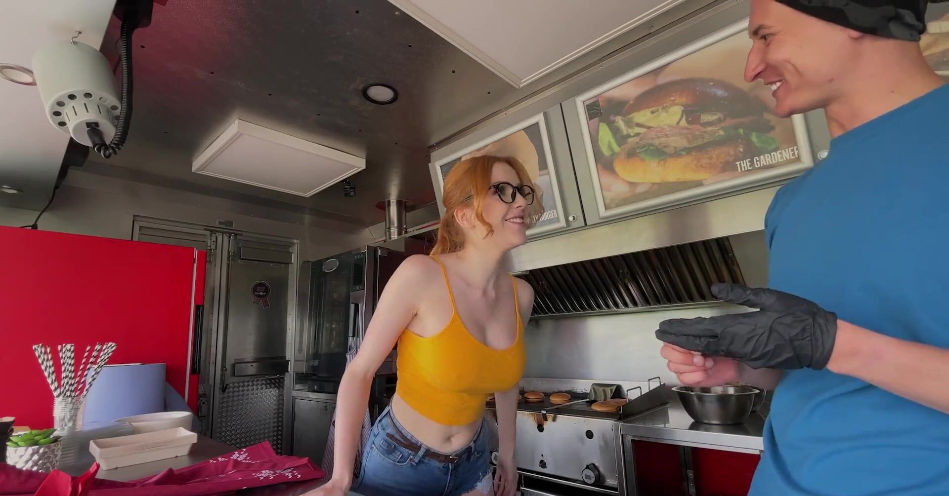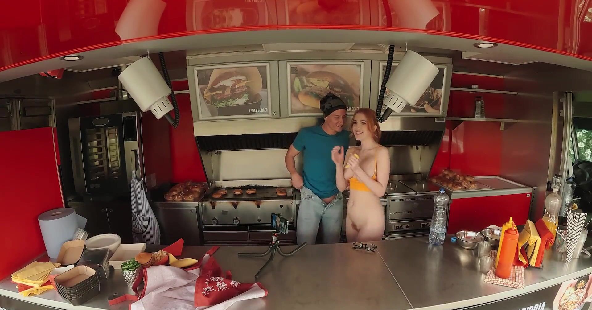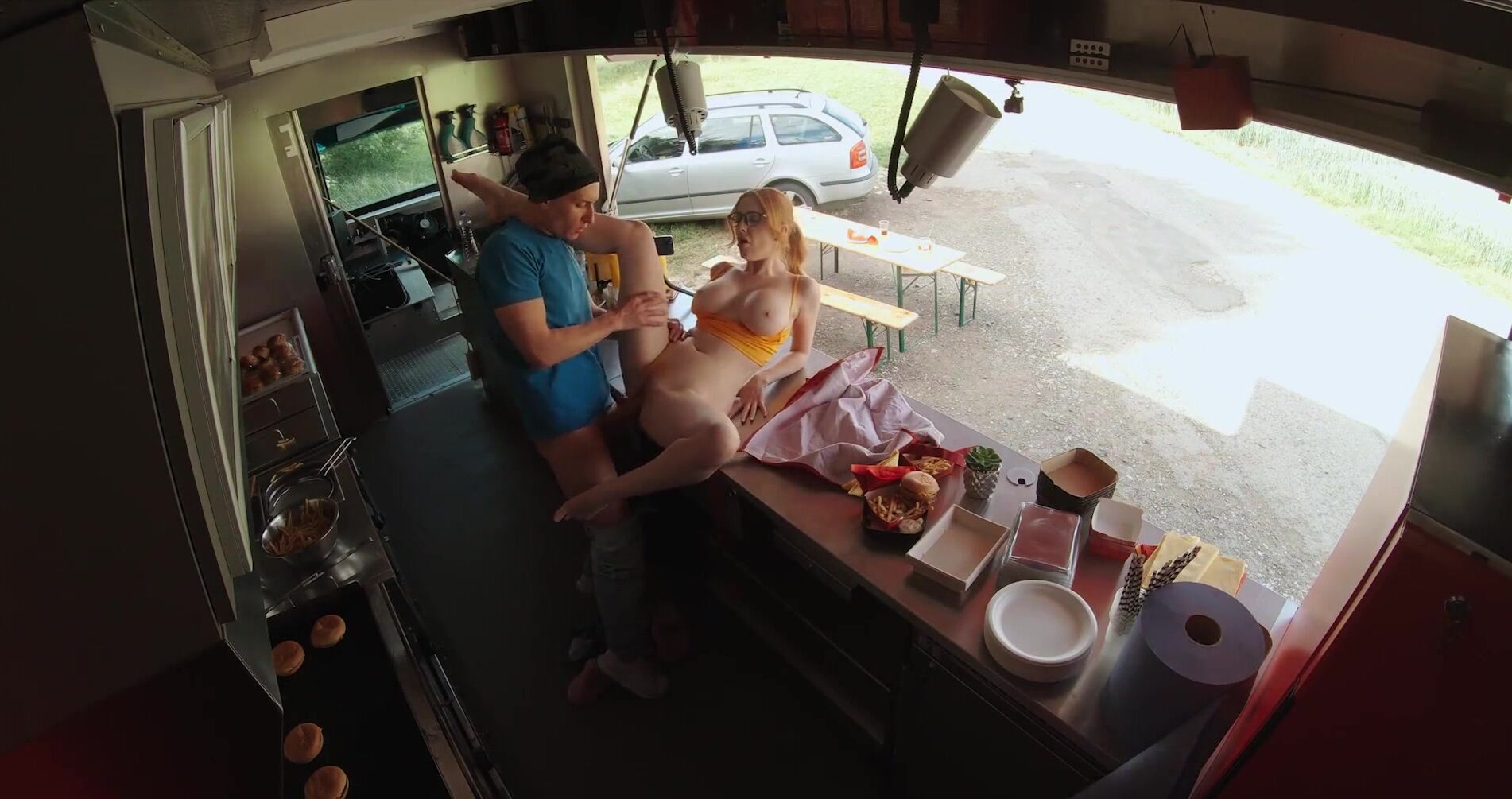 «Рыжая телка готовит уличную еду, жарит картошку фри и бургеры. Но ей бы очень хотелось, чтобы кото-то отжарил её. Когда нет посетителей, привлекательная девка с большими сиськами соблазняет на интим напарника. Тот достает член и угощает им проказницу, а после минета кладет девку на столе и расставляя её ноги в стороны, чтобы вылизать пизду. Парочка страстно ебется на кухне, а кончает пацан ей на очки.»
