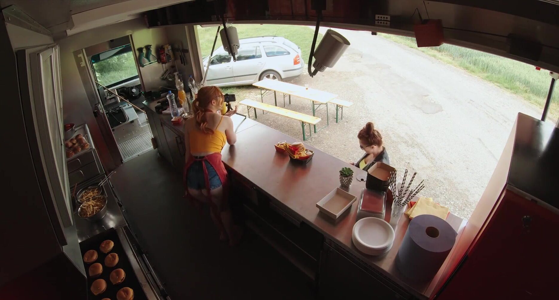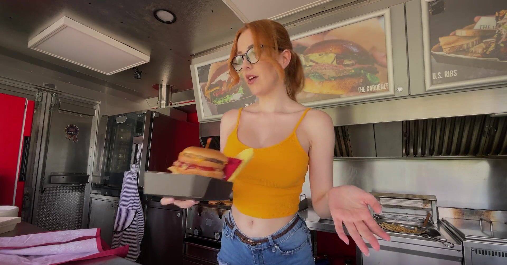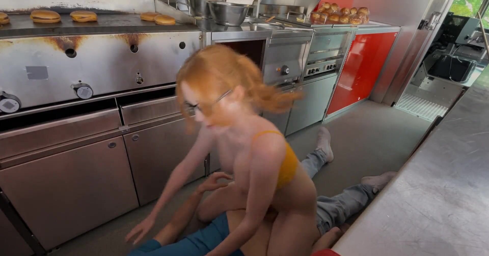 «Рыжая телка готовит уличную еду, жарит картошку фри и бургеры. Но ей бы очень хотелось, чтобы кото-то отжарил её. Когда нет посетителей, привлекательная девка с большими сиськами соблазняет на интим напарника. Тот достает член и угощает им проказницу, а после минета кладет девку на столе и расставляя её ноги в стороны, чтобы вылизать пизду. Парочка страстно ебется на кухне, а кончает пацан ей на очки.»