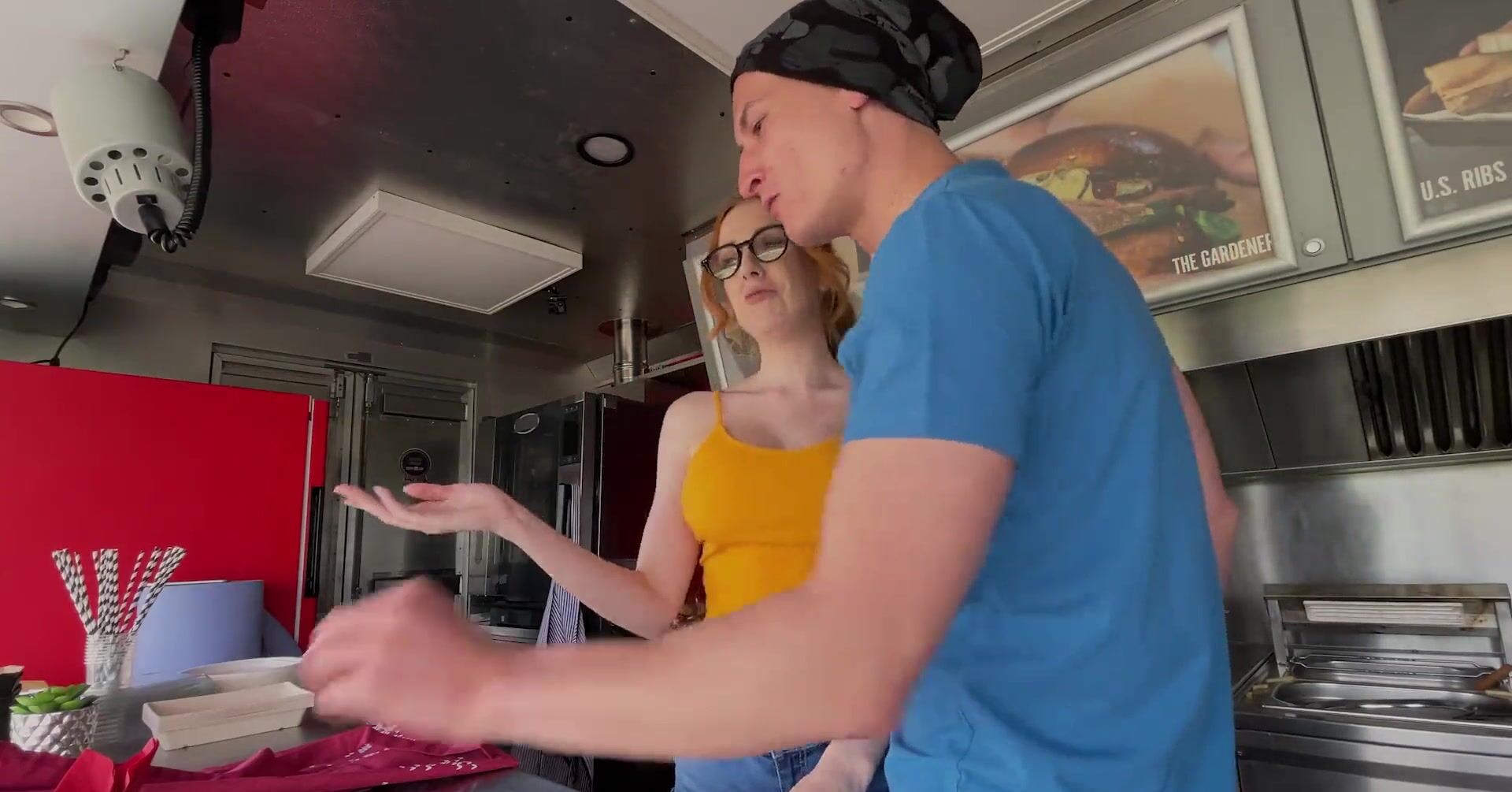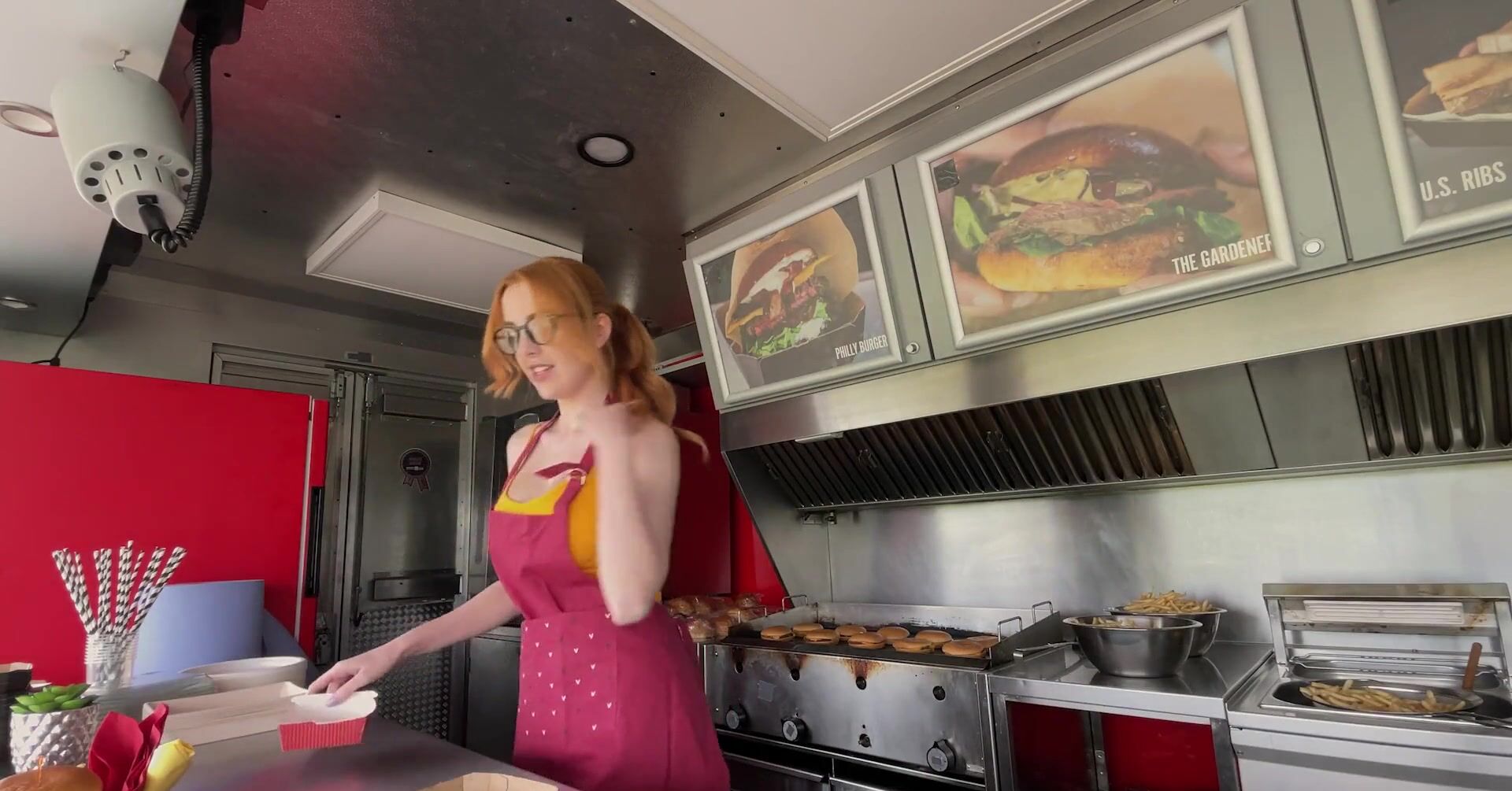 Рыжая телка готовит уличную еду и занимаются жарким сексом