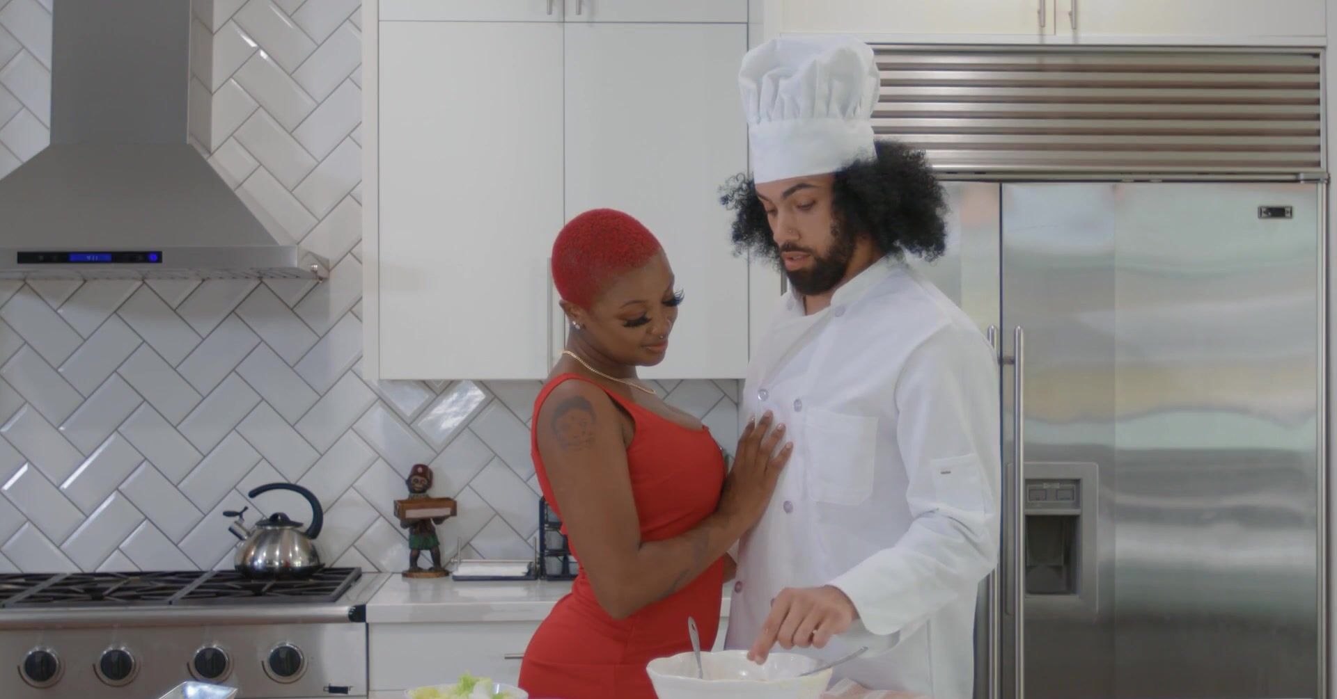 «Лысая негритянка имеет сочное тело и без труда соблазняет чернокожего повара на кухне. Уже вскоре жаркая бестия с красными волосами и татахами по всему телу принимается делать негру смачный минет, смотря ему прямо в глаза. Она знает, что мужчины любят зрительный контакт во время оральных ласк. Негр даже чуть не кончил от её ротика, но смог продержаться. Далее его жилистый хер уже проник в пизду проказниц.»