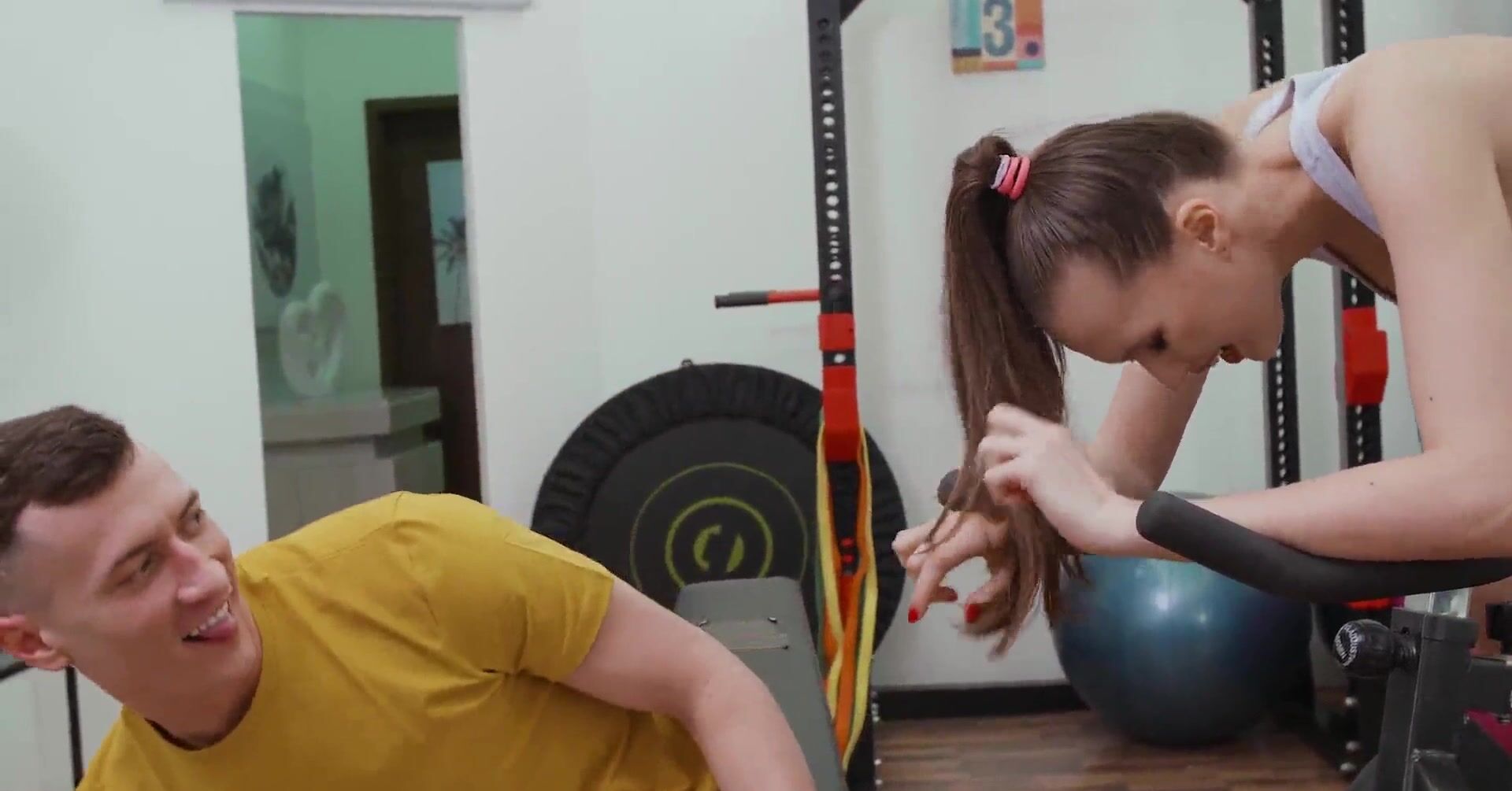 Красотка достает хуй парня в спортзале и смачно сосет