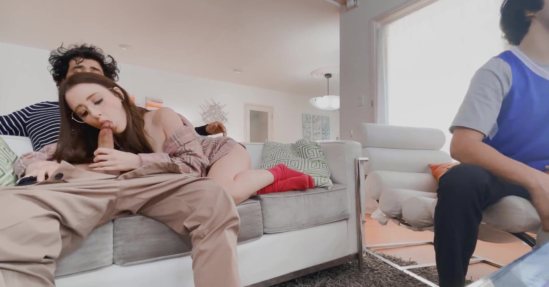 «Привлекательная девушка в очках поглаживает пах друга парня пока бойфренд играет на приставке. Делает это телка за спиной благоверного, но одними подкатами и намеками всё не ограничивается, вскоре цыпочка уже принимается делать мужику смачный минет, доставляя ему нереальное удовольствие. Она ведет гостя в спальню, чтобы там бойфренд не смог им помешать. Девка прекрасно ебется в пизду и получает сперму на ножки.»
