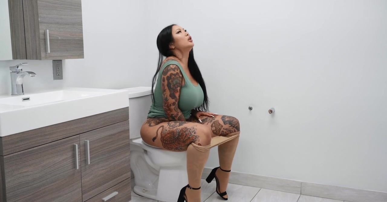 «Красивая азиатка в туалете поднимает платье и показывает свой крепкий член перед другой азиаткой, которая имеет татуированное тело и большие натуральные сиськи. Эта цыпочка с удовольствием опускается на колени и сосет хер трансексуалки, доставляя ей удовольствие. А далее голодная до ебли развратница отдается в пизду и наслаждается вагинальным сексом. Когда проливается сперма на зеркало, она слизывает её.»