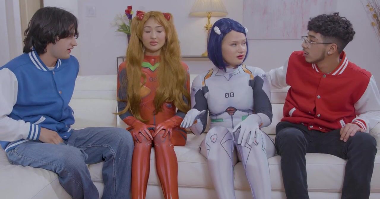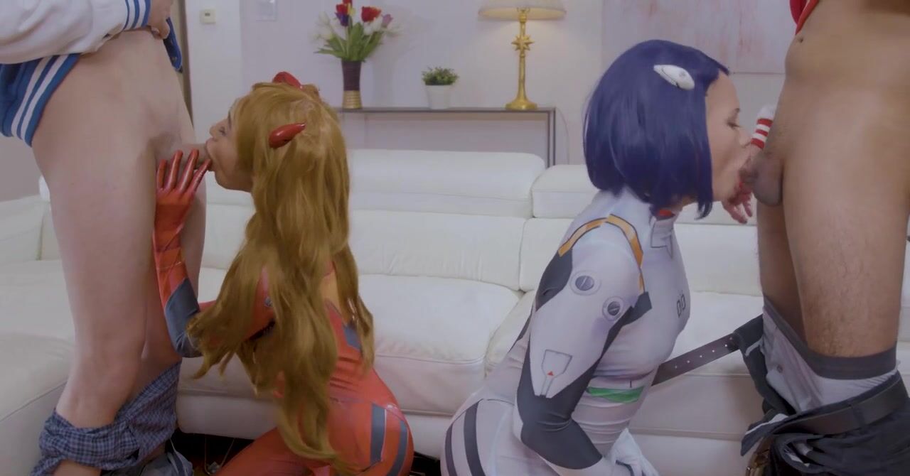«Две привлекательные сестры азиатки очень любят косплеи, они часто переодеваются в героинь любимых аниме. В очень сексуальных образах эти игривые цыпочки предлагают двум парням заняться групповым сексом. Крошка в рыжем парике и её подруга в синем принимаются отсасывать члены ребят, доставляя удовольствие, а после минета они отдаются в пизденки и наслаждаются еблей по полной программе, томно постанывая.»
